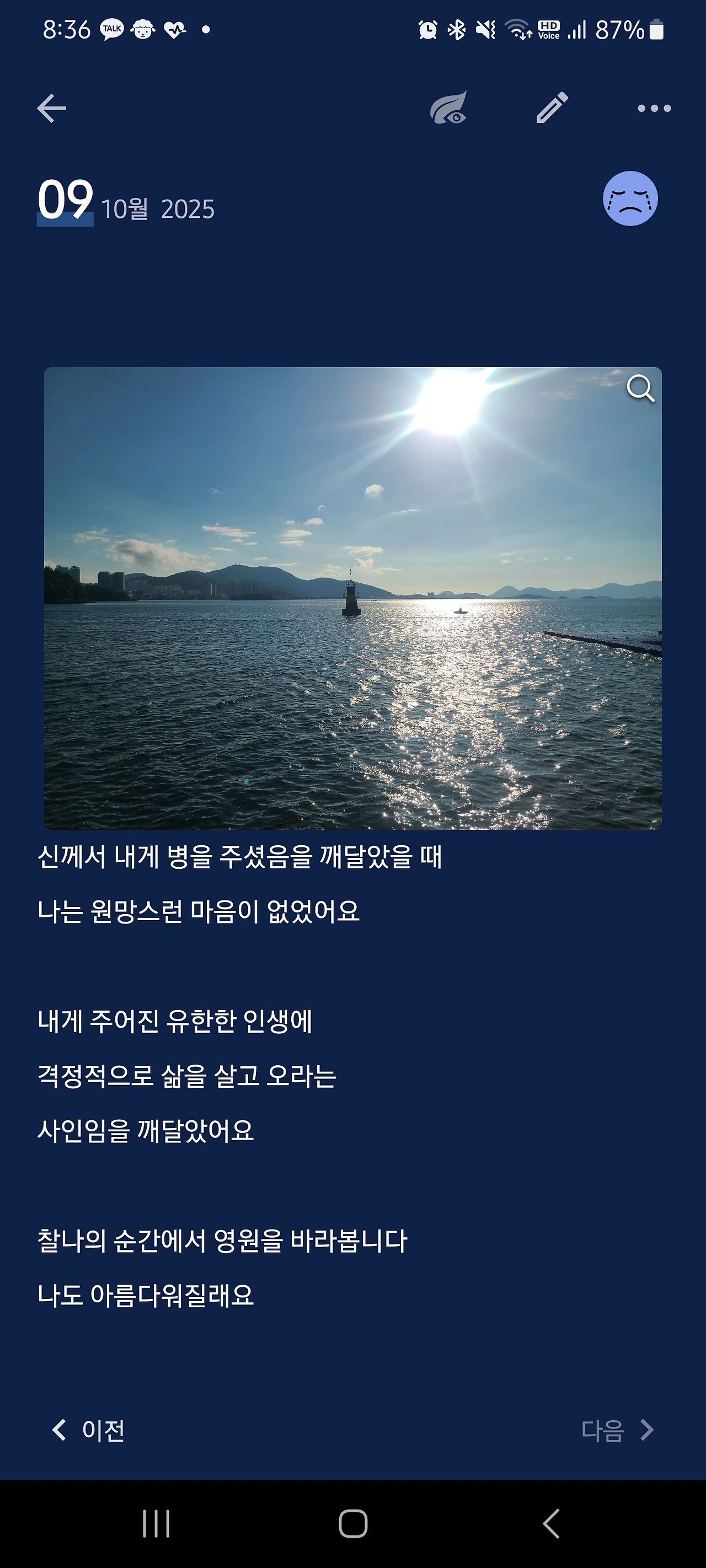 그날 있었던 일에 대해 의미를 부여하는 일은 전적으로 내가 하는 일이다. 스스로 경험한 환대의 경험, 내게 병이 찾아온 일, 내가 글에서 풀어내는 많은 일들 이것은 우연이 아니라고 믿기로 했다. 내게 찾아온 위대한 선물들로 여기며 오늘 하루를 살아내겠다.
