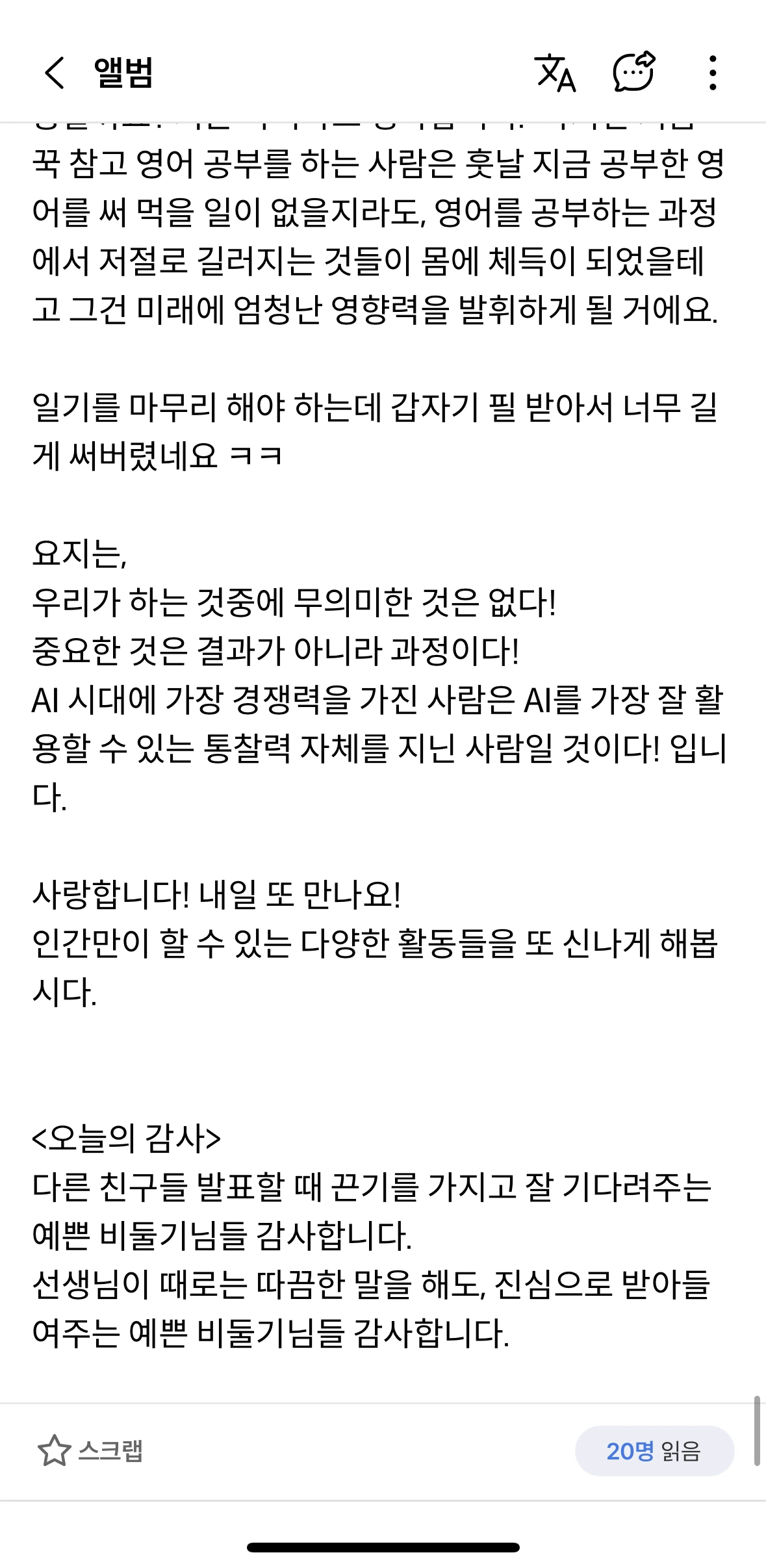 그리고 교사 경력 6년차가 된 2012년, 처음으로 교실 일기를 쓰기 시작했다. 그때는 지금처럼 스마트폰과 연동된 프로그램이 없어서 네이버 카페를 활용했었다. 학급 홈페이지가 해년마다 리셋되는 게 좀 아까웠기 때문이다. 지금은 그냥 자료 보존에 대한 특별한 미련 없이 하이클래스라는 교육 플랫폼에 올리고 있다. 1년 동안 꼬박꼬박 쓴 글이 영원히 사라져 버리는 것이 크게 아쉽지 않은 이유는, 어떤 교실이든지 1년 살이가 특정한 지점에서 비슷한 부분에 수렴한다는 것을 느끼기 때문일지도 모른다. 물론 지금 아쉽지 않다고 해서 나중에 후회하지 않는다는 보장은 없지만.