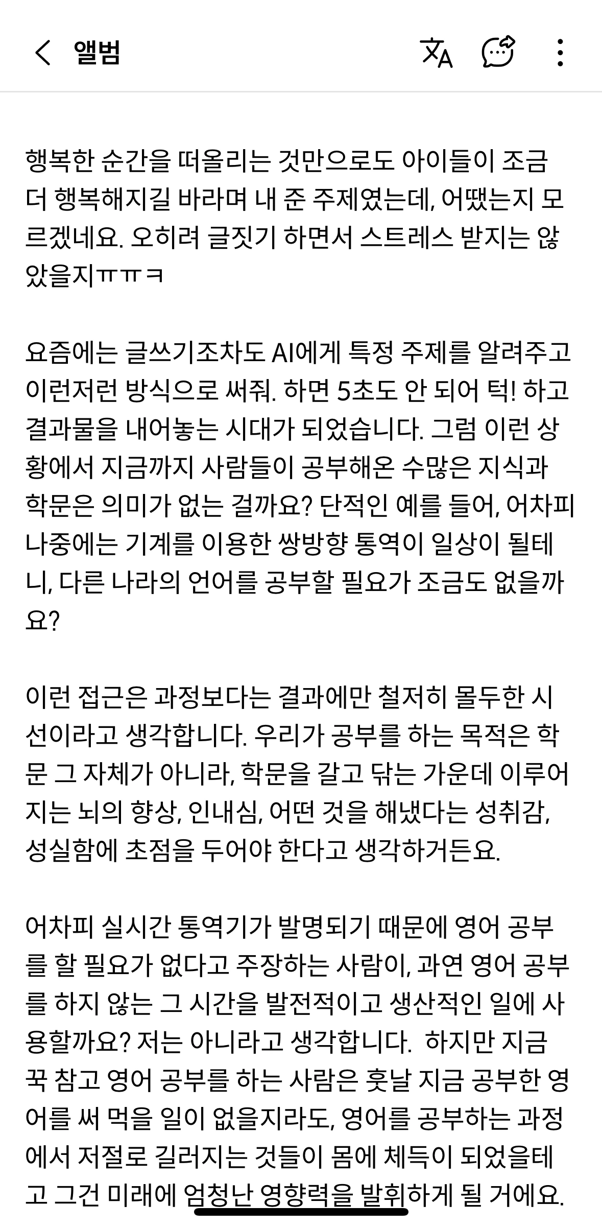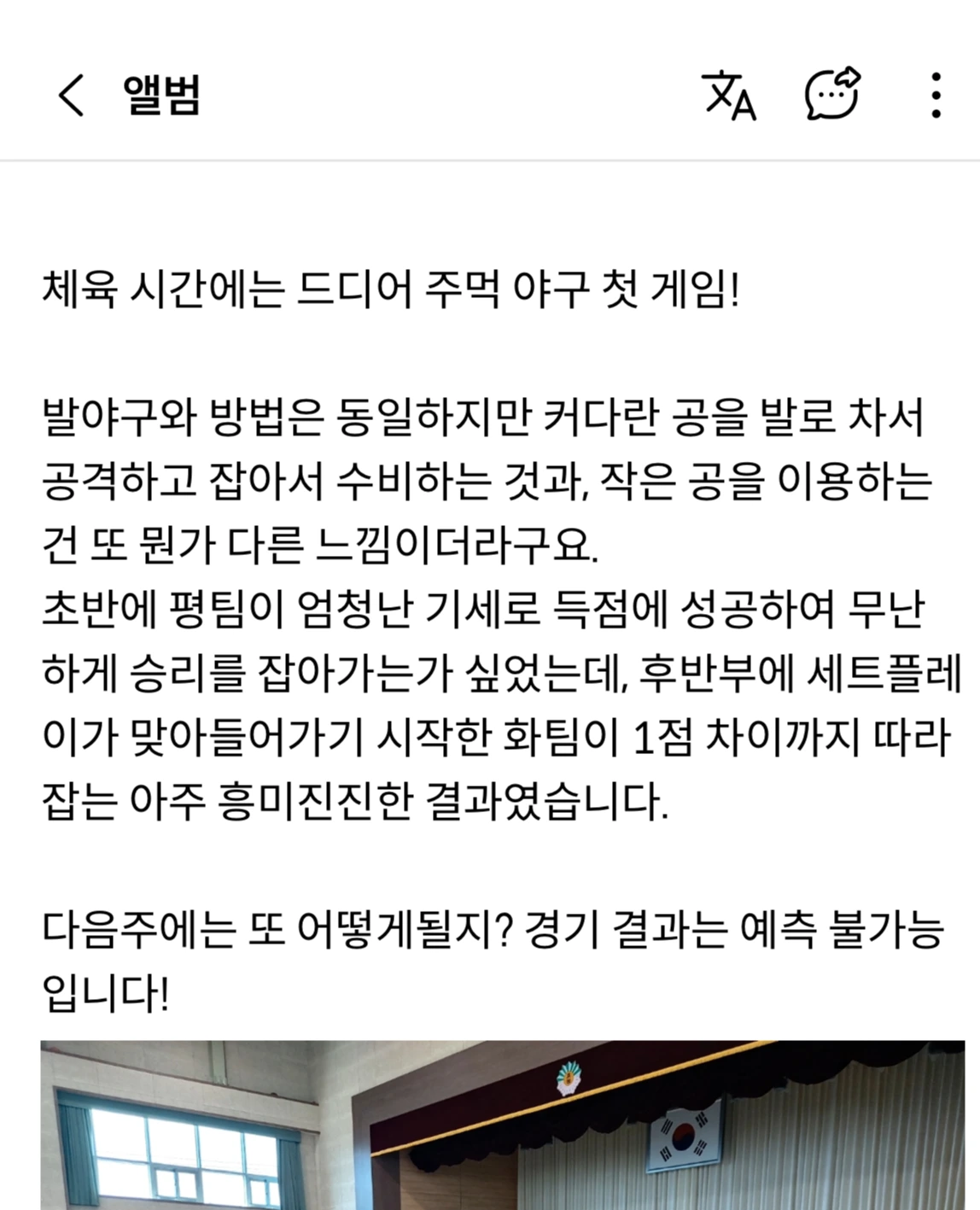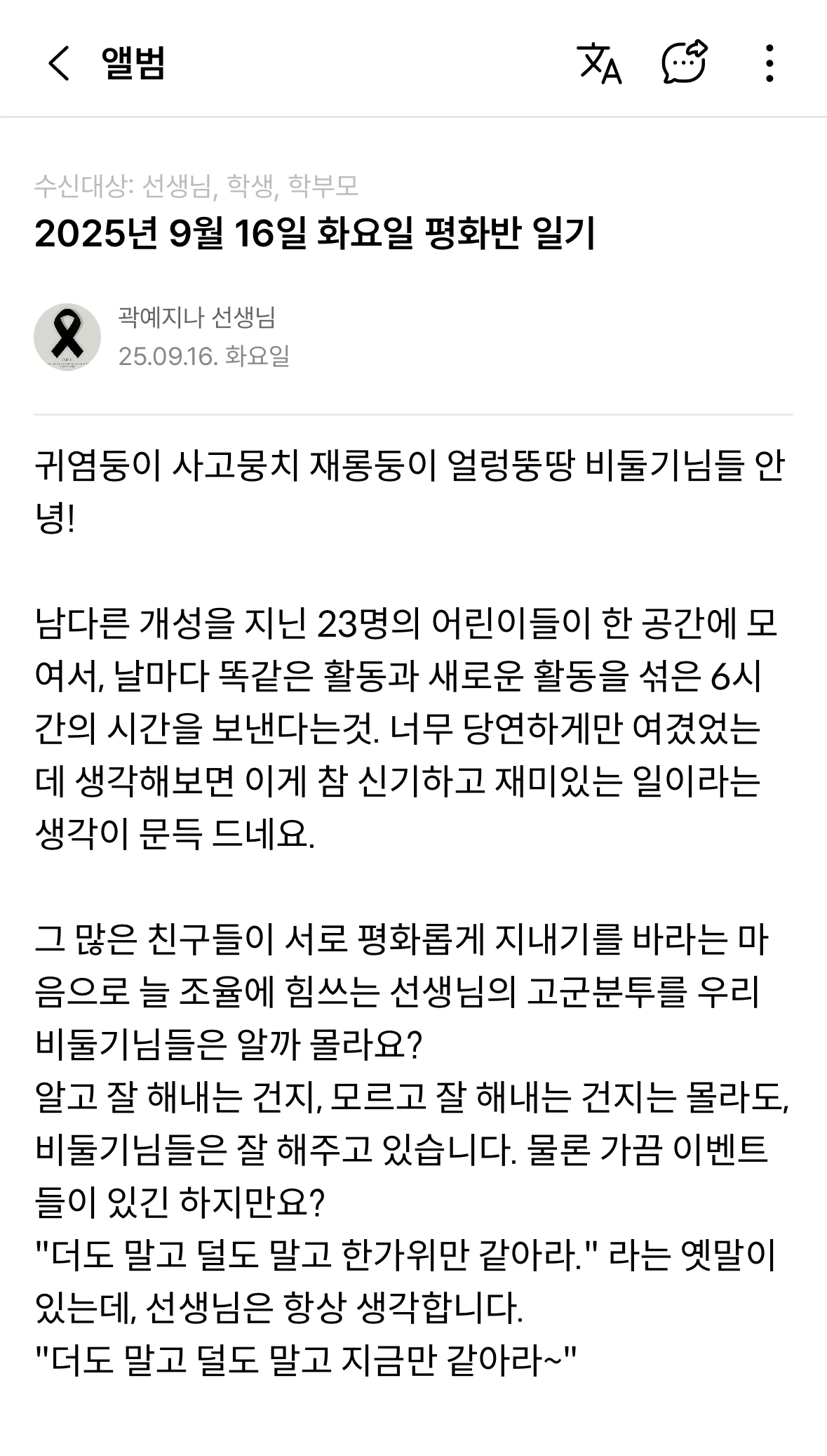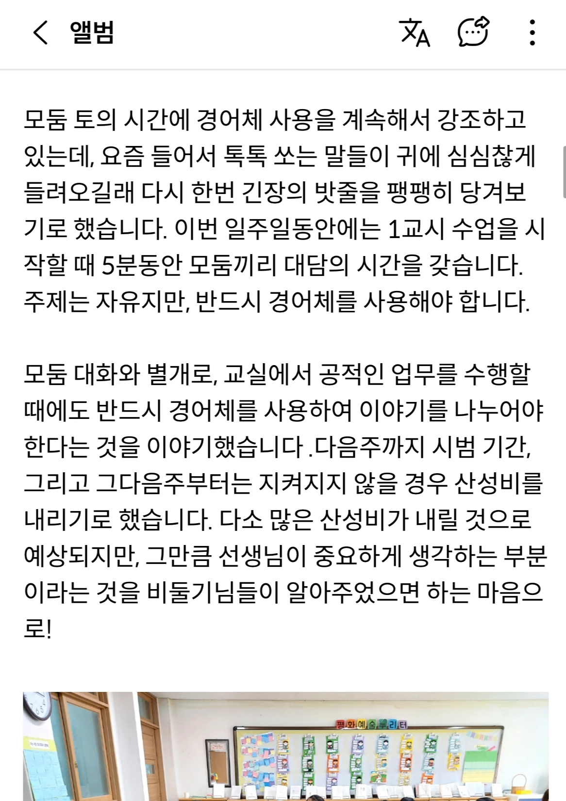그리고 혹시나 노파심에서 덧붙이는 한마디. 나는 교사이지만 동시에 엄마이기 때문에, 가끔 엄마들끼리의 모임에서 담임 선생님의 뒷담화 아닌 뒷담화를 듣게 된다. 작년 선생님은 사진을 자주 올려주셨는데, 올해 선생님은 아무것도 올려주시지 않아서 답답하다는 것이다. 하지만 교사의 업무에 학급의 사진을 주기적으로 게시해야 한다는 의무는 없다. 나 또한 학급을 잘 경영하기 위한 하나의 방편으로 교실 일기를 활용하고 있을 뿐이다. 하루동안 소화할 수 있는 교사의 노동력에는 한계가 있기 때문에, 이 쪽에 노력을 기울인다면 다른 쪽에는 아무래도 소홀해지기 마련이다. 나의 경우에는 학부모님께 직접적으로 보이는 교실 일기를 쓰는데 에너지를 사용하고 있으니 다른 방법으로 교실을 돌보는 작업에는 손이 덜 가게 될 것이다.