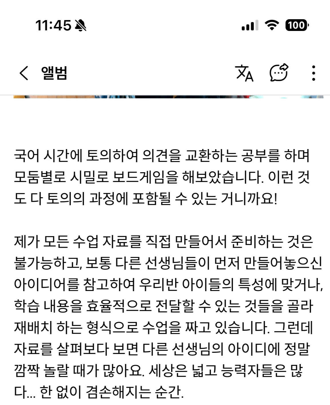 혹시나 학부모님께서 보시기에 선생님께서 교실에 대한 정보를 많이 알려주시지 않더라도, 그 시간만큼 그 선생님께서는 다른 부분에서 자신의 역량을 힘껏 발휘하고 계실 것이다. 그러니 평소에 사진이나 영상 등을 많이 업로드해주시지 않는다고 해서 교실에 관심이 없거나 교육에 소홀한 선생님이라고 생각하지 않으셨으면 좋겠다. 내가 날마다 직접 뵙고 있는 현장의 선생님들은 다들 정말 존경스러울 정도로 헌신하시는 분이 많기 때문이다.