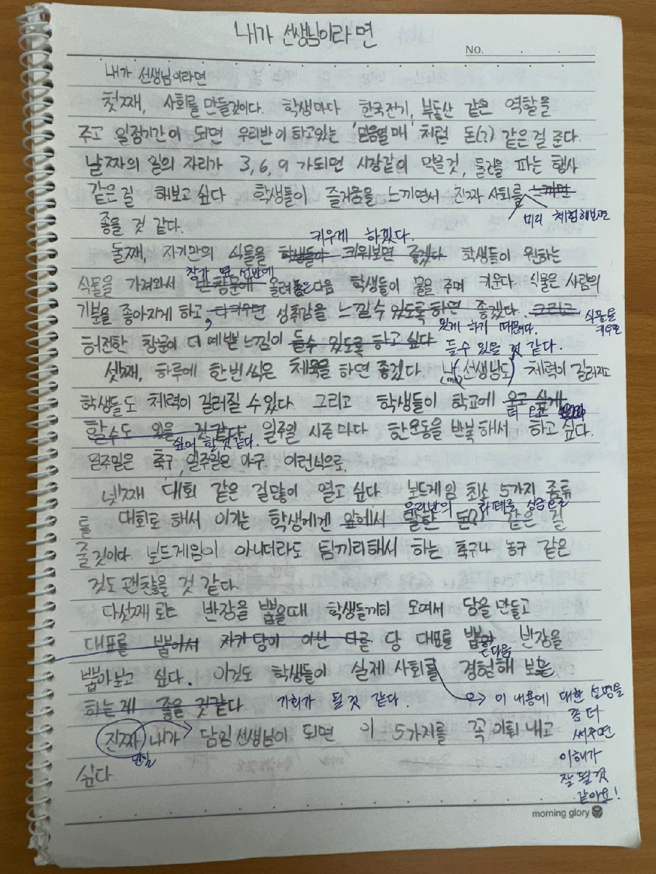 학생들이 쓴 글은 교사가 일주일 동안 꼼꼼하게 읽어보고 색깔 볼펜을 이용하여 교정을 해 준다. 띄어쓰기나 맞춤법 등 간단한 교정에서, 문단 바꾸기, 특정 문장의 수정과 삭제, 문장의 순서 재배치 등의 다소 복잡하고 여러 번 생각해야 하는 교정까지 아낌없이 쫙 그어 표시해 준다. 이렇게 교정이 된 공책을 돌려주면 학생들은 어떤 부분이 수정되었는지 확인하고, 다른 공책에 깨끗하게 옮겨 적는다. 1년이 끝나면 학생들은 정선된 글이 모인 자신만의 문집 공책을 한 권씩 갖게 된다.