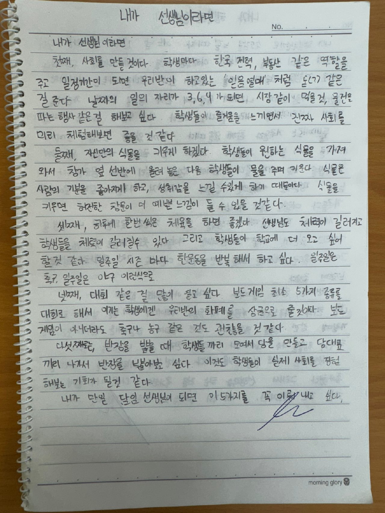 학생들의 글쓰기 능력을 길러주기 위해 2주에 한 번씩 주제 글쓰기를 한다. 주제는 시기에 따라 교사가 적절한 내용을 선정한다. 글쓰기 분량은 현재 내가 가르치고 있는 5학년의 수준에서 5~6학년 용 공책 한 페이지 정도는 대부분 채울 수 있다. 보통 40분 정도 글쓰기를 하는데, 빨리 쓰는 학생들은 20분 내에도 한 편을 써내고 늦게 쓰는 학생들은 40분이 지나도 완성이 되어 있지 않는 경우가 있다. 40분 동안 정말 머리 싸매고 열심히 고민했는데 한쪽 분량을 다 채우지 못했으면 그냥 여백의 미를 살릴 수 있도록 하고 있다. 글쓰기와 원수 지게 만들 생각은 없기 때문이다.