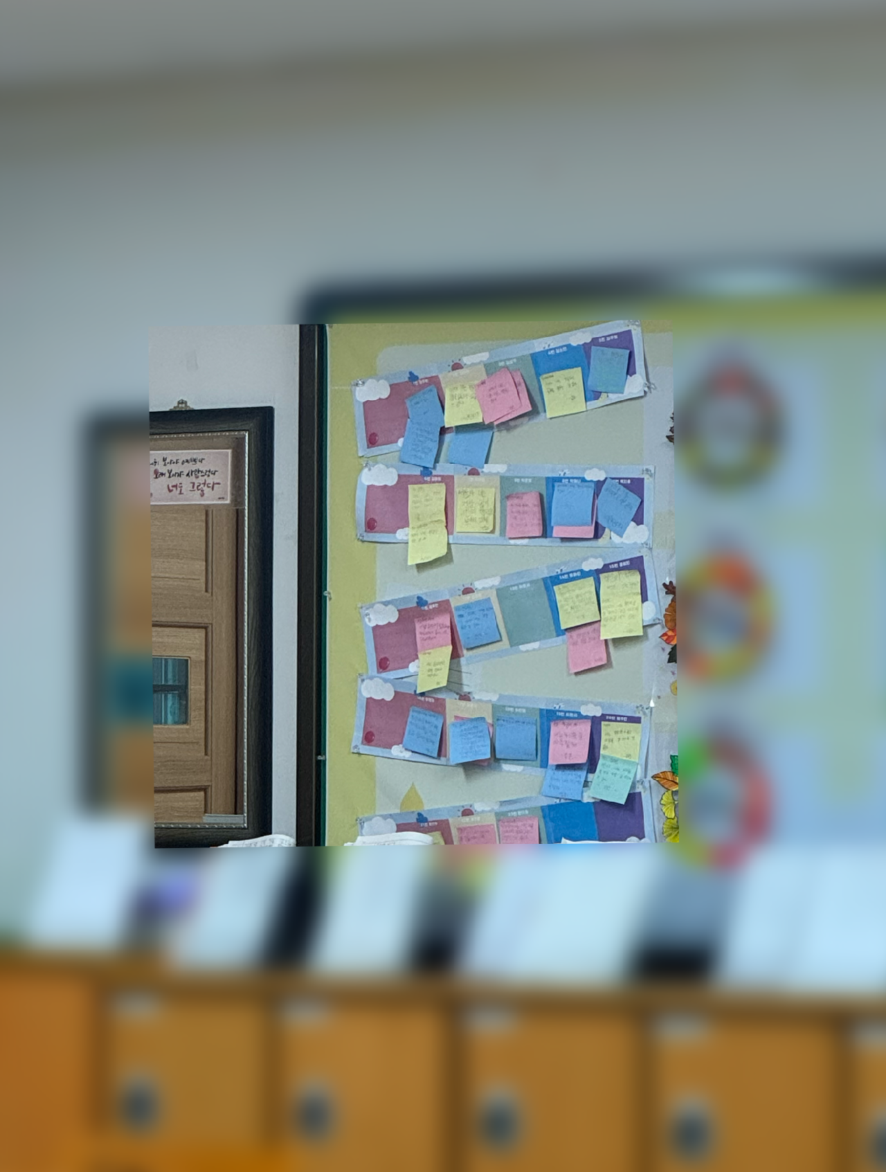 우리 반에는 뒷 게시판 왼쪽 전체를 차지하고 있는 칭찬판이 있다. 믿음 열매와 관련된 글에서 한번 언급한 적이 있는 친구 칭찬판이다. 한 사람 당 2명의 친구까지 칭찬을 할 수 있고, 붙임 딱지에 칭찬 내용을 적어서 교사에게 가지고 오면 교사가 읽어본 뒤 통과를 시켜주거나 내용을 좀 더 덧붙여올 것을 요청한다. 통과가 된 경우 믿음 열매 관리자에게 한 장의 칭찬 당 믿음 열매 3개를 지급해 달라고 말한 뒤, 칭찬판의 해당 친구 자리에 붙이면 된다.