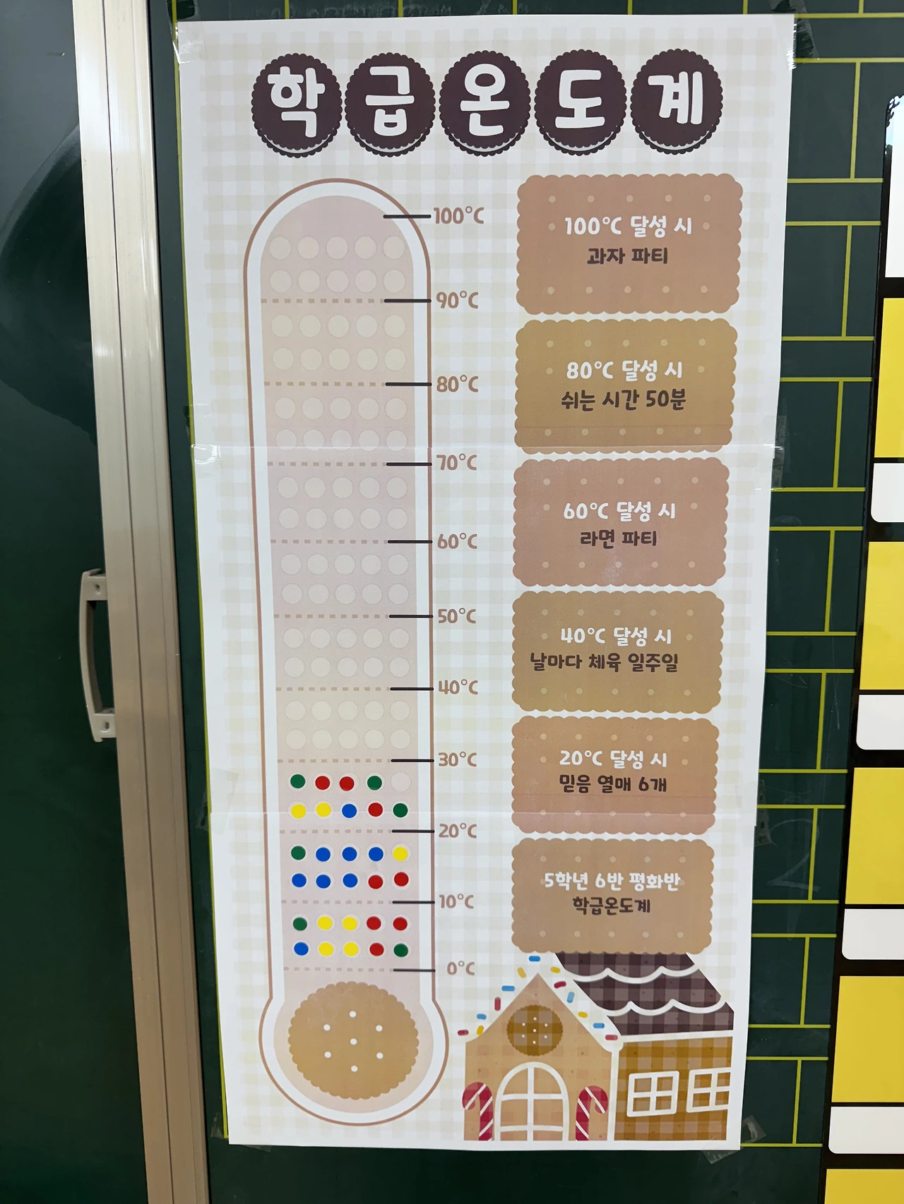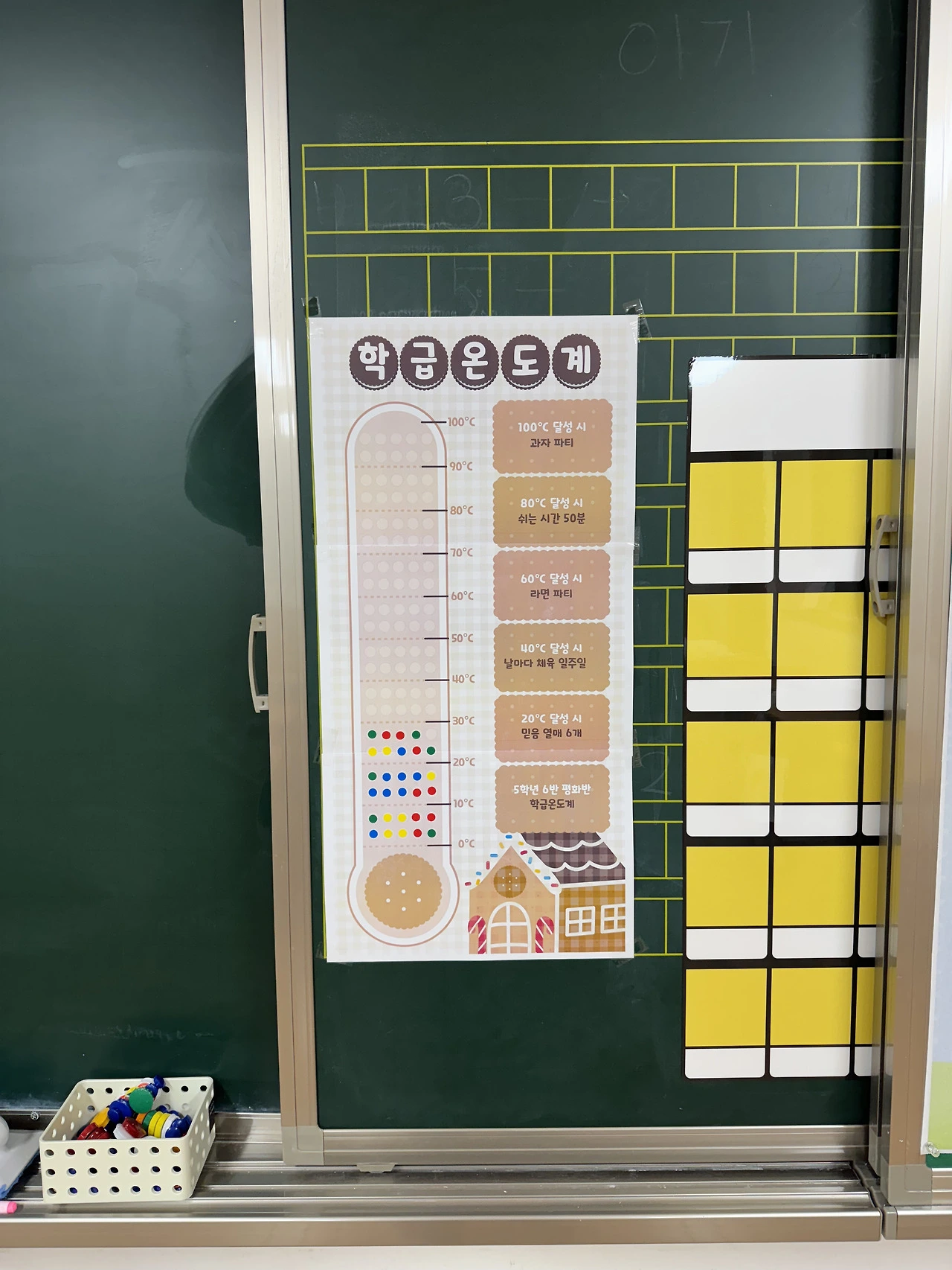 하루하루 지내다 보면 어느새 야금야금 올라가서 해당하는 보상을 받는 재미가 은근히 쏠쏠하기 때문에, 아이들이 하루에도 몇 번씩 칠판에 붙어있는 학급 온도계를 들여다보면서 앞으로 몇 도가 남았는지 계산하는 모습을 꽤 자주 볼 수 있다.