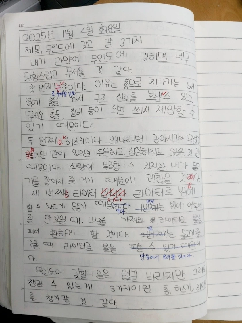 2학기의 후반에 접어들면 학생들이 스스로 퇴고할 수 있는 절차를 하나 더한다. 초안을 제출하기 전에 자신의 글을 읽은 뒤 빨간색 볼펜을 이용해 1차로 교정을 하는 것이다. 교사는 1차 교정이 된 글을 읽고 나서 파란색 볼펜을 이용해 2차 교정을 하고 학생들에게 돌려준다. 그전까지는 교사가 일방적으로 고쳐준 글을 읽었다면, 이제부터는 자신의 글을 스스로 점검해 볼 수 있는 기회가 생긴다. 학생들은 이를 통하여 글쓰기 과정에 좋은 습관을 기를 수 있다. 글은 일단 쓰는 것이 제일 중요하지만, 어떻게 고쳐 쓰느냐에 따라 그 완성도가 완전히 달라질 수 있기 때문이다.