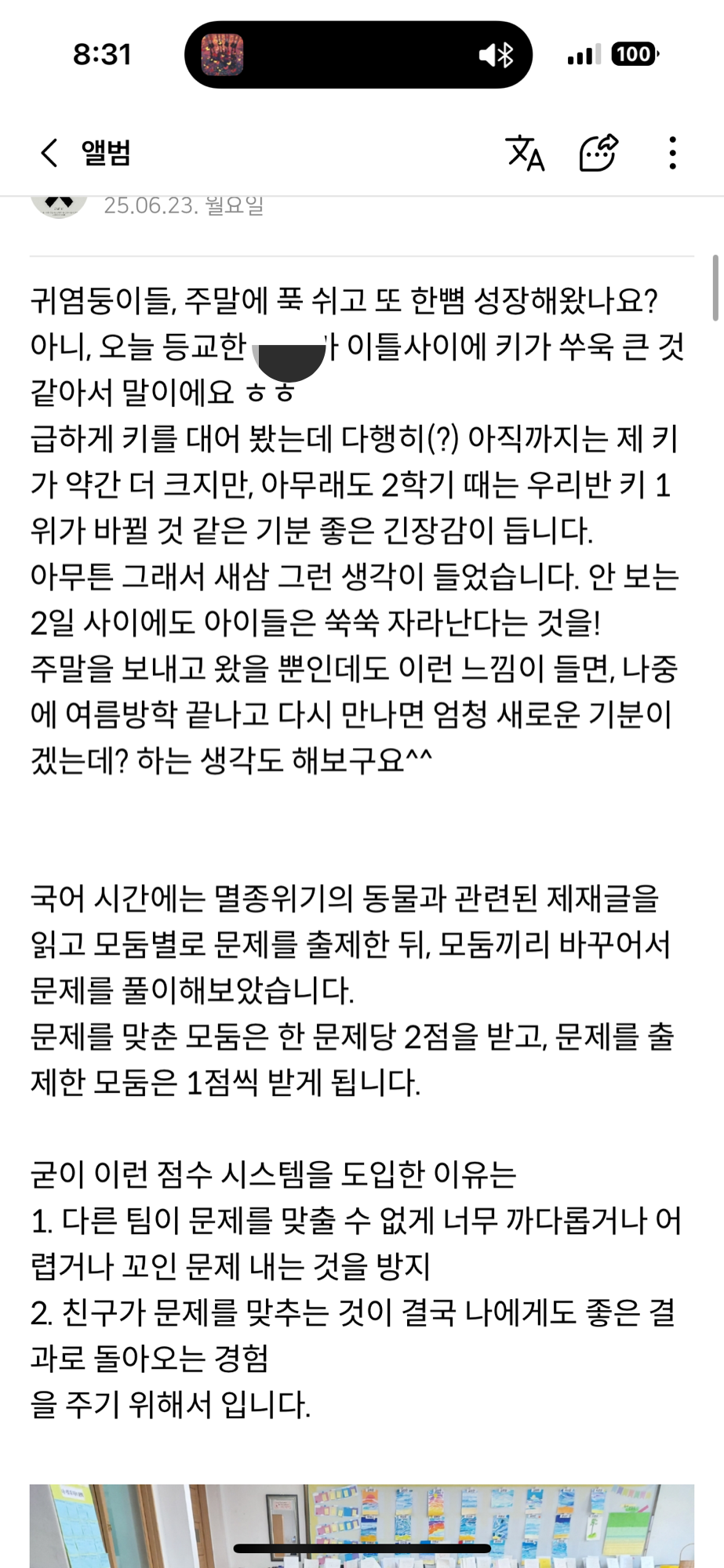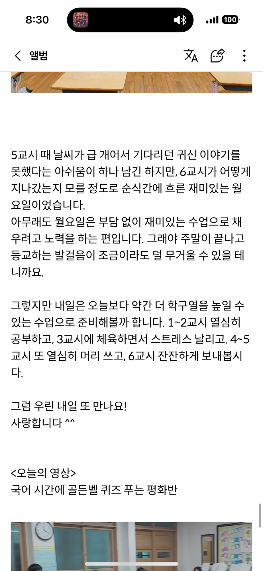 새벽마다 쓰는 일기 외에, 내가 날마다 쓰는 일기가 한 가지 더 있다. 그건 바로 교실 일기이다. 보통 학급마다 소통 플랫폼이 하나씩은 있는데(알림장이나 학생들 사진 올리는 공간), 나는 그곳에 일기를 올린다. 그날 공부한 내용, 아이들과의 자잘한 에피소드, 하루를 보내며 느낀 생각이나 감상, 요즈음의 교실 분위기 등등.