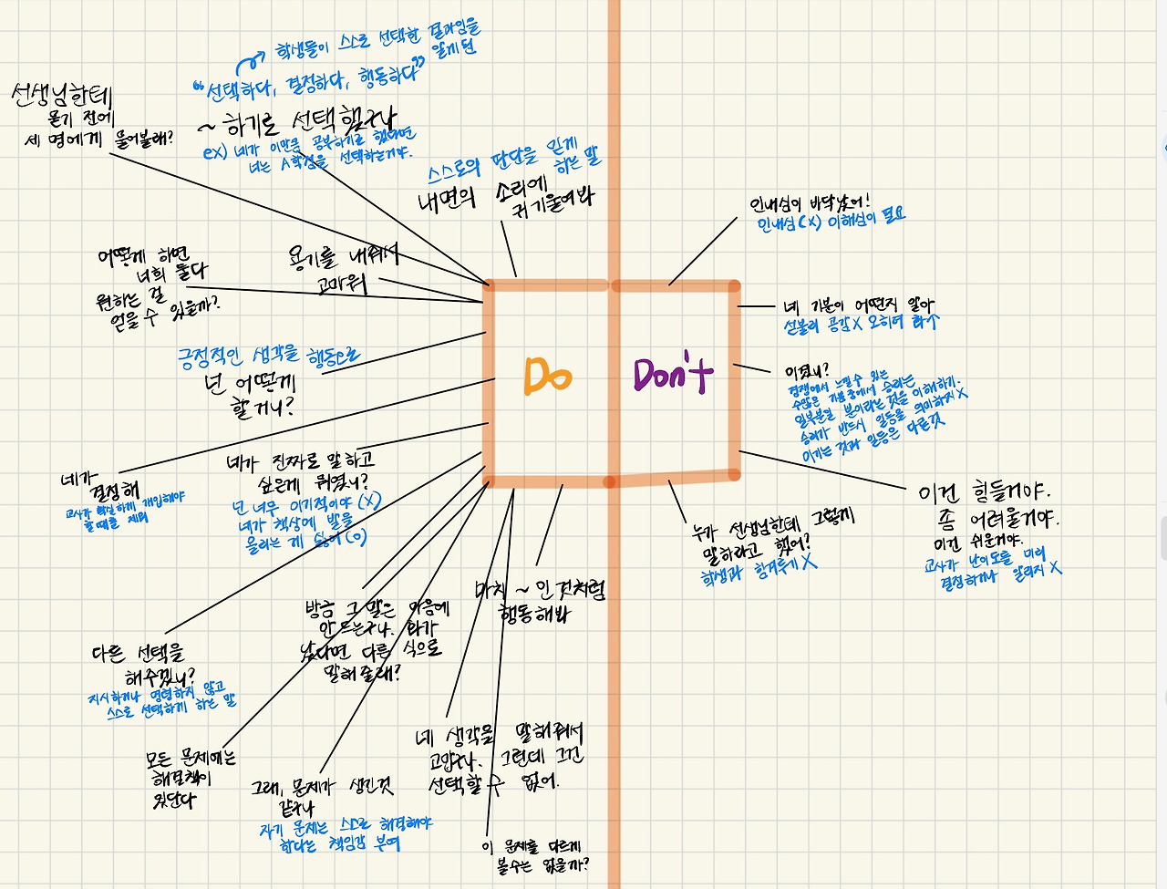 이렇게 책의 초반부터 절대 동의할 수 없는 사례가 등장하는 바람에 ‘이 책을 계속 읽어, 말아?’하는 갈등이 잠시 있었지만, 다행히 그다음부터는 저자와 내 의견이 일치하는 경우가 대부분이어서 끝까지 잘 읽어나갈 수 있었다. 다 읽고 나서 이 책에 소개된 67가지의 대화법 중 나에게 필요한 것을 추려서 정리해 봤다. 쓰면 안 되는 용례들은 이미 내가 평상시에 안 쓰려고 노력하고 있는 것들이 많아서 적을 것이 별로 없다는 사실이 약간 뿌듯했고, 사용하면 좋은 문장에는 반 아이들 뿐만 아니라 나 스스로에게 해 주면 좋을 것 같은 대화들이 있어서 유익했다. 특히 받아들이기 힘든 문제 상황이 생겼을 때 “이 문제를 다르게 볼 수 있을까?”라는 문장은 지금 나에게 제일 필요한 문장이었다.