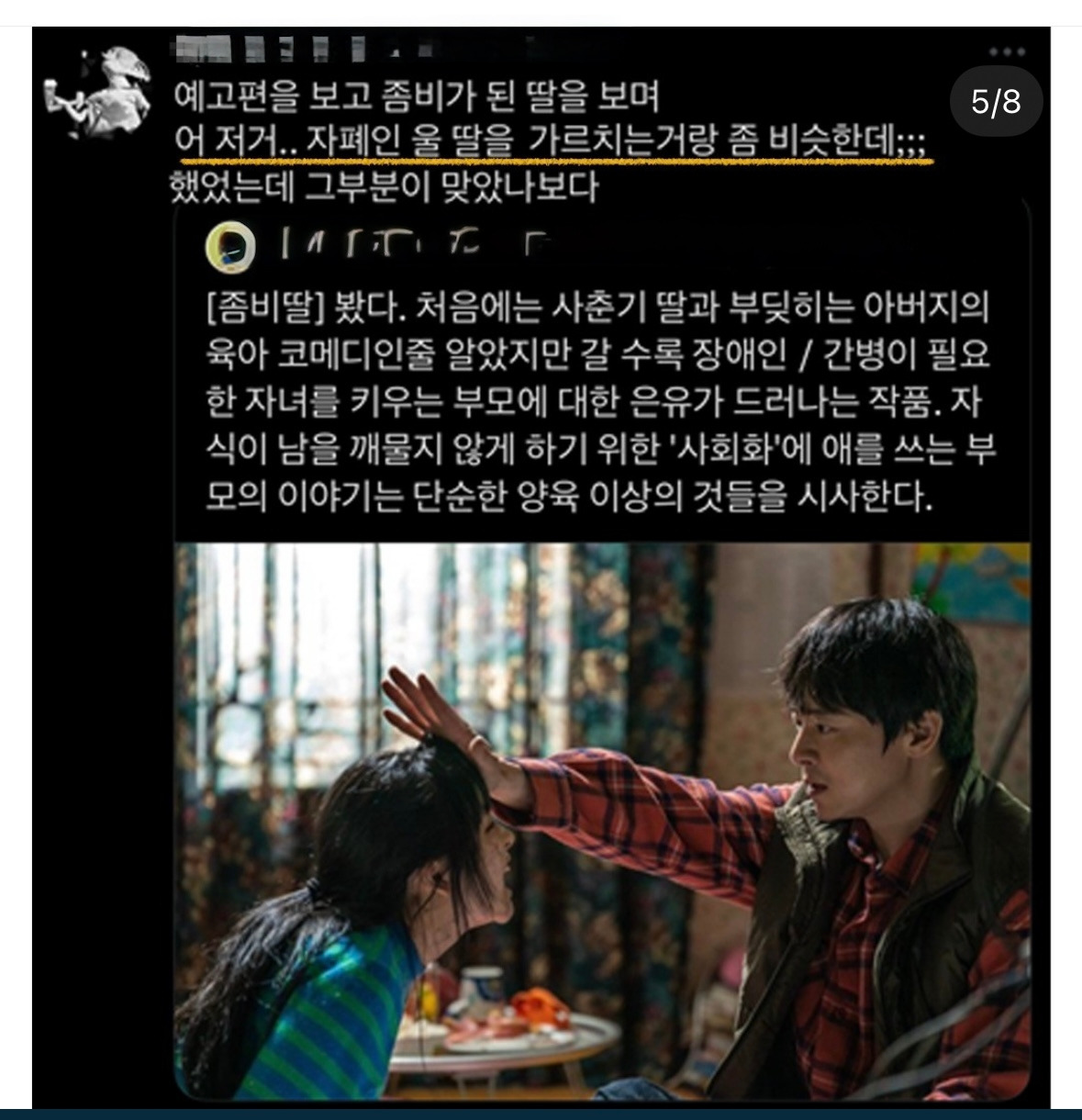 여름방학 시즌에 개봉한 <좀비딸>. 영화를 특별히 챙겨보는 편이 아니라서, 그냥 흘깃 보고는 넘겼는데 이 영화를 보러 갈 생각이 들었던 이유는 인스타에서 이런 코멘트를 접했기 때문이었다.