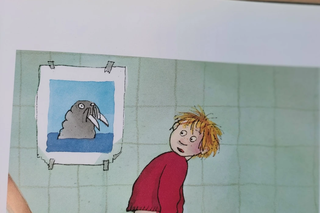 화장실에 가고 싶지 않거나 화장실에 괴물이 있다고 생각한 아이들의 마음이 잘 표현되어 있다. 화장실에 가고 싶지만 변기 속에서 괴물이 나타나 엉덩이를 물어버릴 것 같은 두려운 마음 때문에 화장실에 가지 못하는 아이들이 분명 있을 것이다. 변기에 앉으면 아무 것도 보이지 않는다. 변기와 연결된 것이 무엇인지 모른다. 다만 물웅덩이만 보일 뿐이다. 일을 보고 물을 내리면 시끄러운, 무언가 빨아들이는 소리와 함께 감쪽같이 사라진다. 보이지 않는 무언가가 쑥 잡아 당겨버리는 변기란 얼마나 무서운 것인가. 무서운 것이 어찌 변기뿐이겠는가. 문을 닫고 혼자 있어야한다는 점도 눈여겨보아야할 부분으로 읽힌다. 어른도 혼자는 무서운데, 아이들에게 혼자는 무슨 일이 생겨도 어디에도 도움을 청하지 못하고 갇힌 마음이 들 것이다. 그래서 율리는 화장실에 혼자 가려고 하지 않고 친구들과 함께 가기를 원했고, 율리가 혼자 벌을 서고 있을 때, 카트린이 와서 용기를 주었던 것이다. 그것도 자신도 그런 실수를 했다는 것을 말함으로써 율리의 상처 난 자존심에 약을 발라주면서.