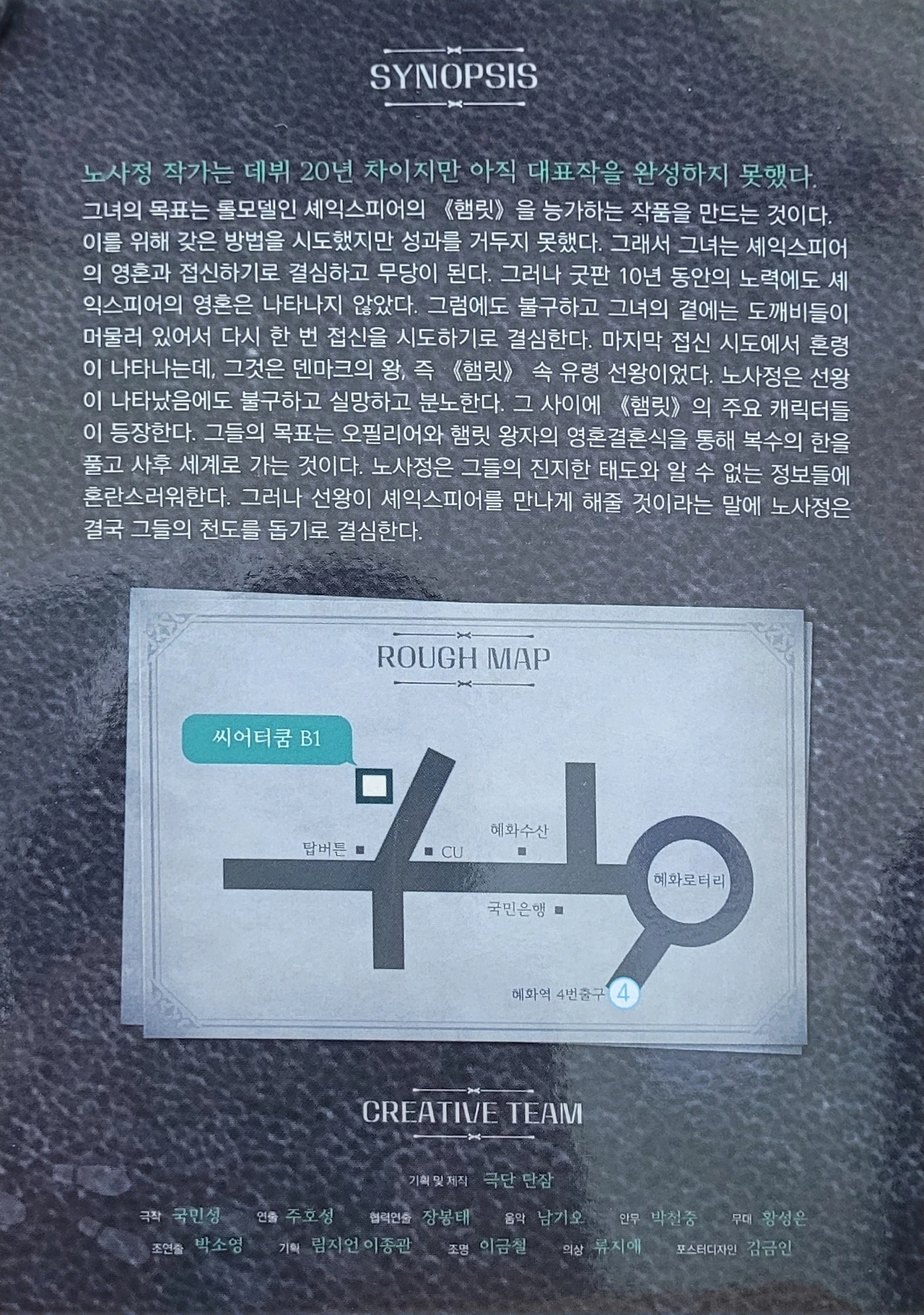 장염 때문에 야채 주스가 가득든 유리 잔을 들고 걷는 것 같은 불안한 몸 상태였으나 '굿바이 햄릿'은 꼭 봐야 할 공연이었기에 '똥트라볼타'를 각오하고 약을 한 줌 털어 넣고 대학로 '시어터 쿰'을 찾았다.