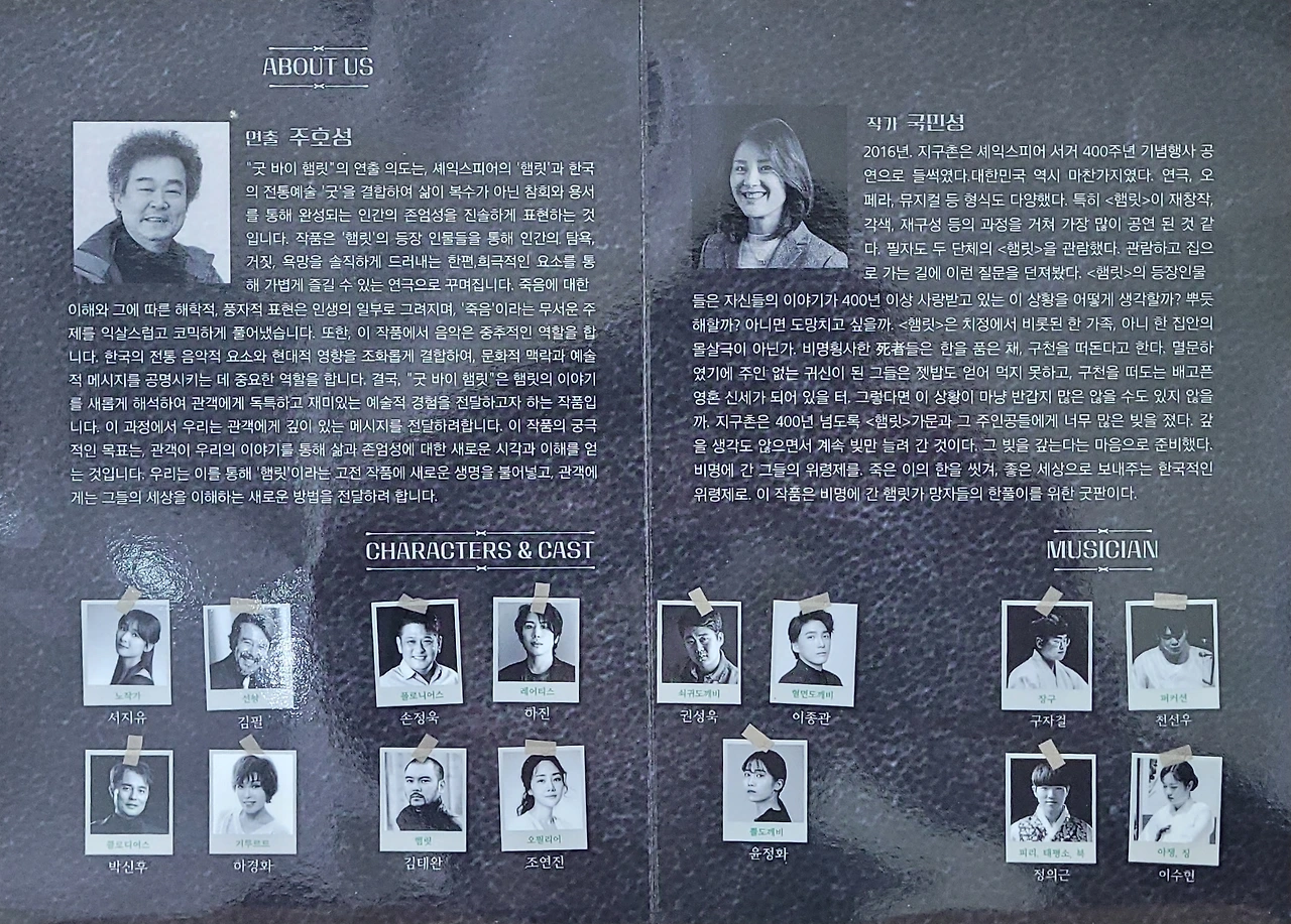 100석이 조금 넘는 소극장이니 무대가 넓으면 얼마나 넓겠는가? 그 좁은 무대에 햄릿의 중요 출연자와 새로 설정된 배역의 출연자, 전통음악 반주를 맏은 악사까지 약 15명 출연자가 각자 배역을 연기하며 잔잔한 웃음과 감동을 주었는데, 굿판을 주도했던 무녀, 부산사투리 심하게 쓰는 도깨비, 민머리 햄릿, 우쿠렐레를 매고 나온 오필리어, 나사가 많이 풀린 햄릿 아빠, 몸쓰는게 아주 요염한 햄릿 엄마, 호색한 햄릿 작은아빠, 은근한 껄떡남 오필리어 아빠, 말 더듬는 오필리어 오빠의 등장에 내 인생에 100분 이라는 시간이 순삭 되었다.