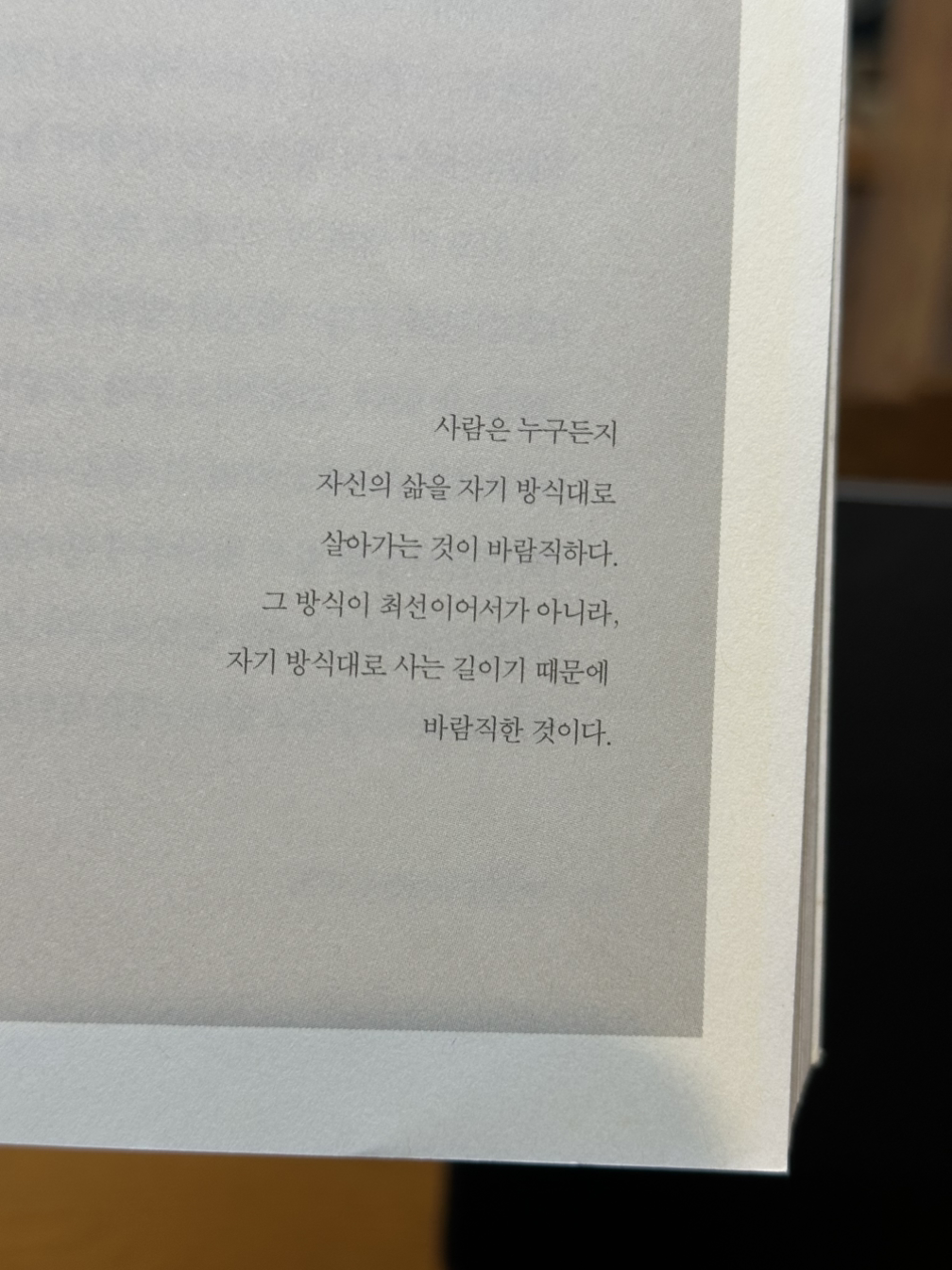 사람은 누구든지 자신의 삶을 자기 방식대로 살아가는 것이 바람직 해. 그 방식이 최선이어서가 아니라, 자기 방식대로 사는 길이기 때문에 바람직한 것이거든.