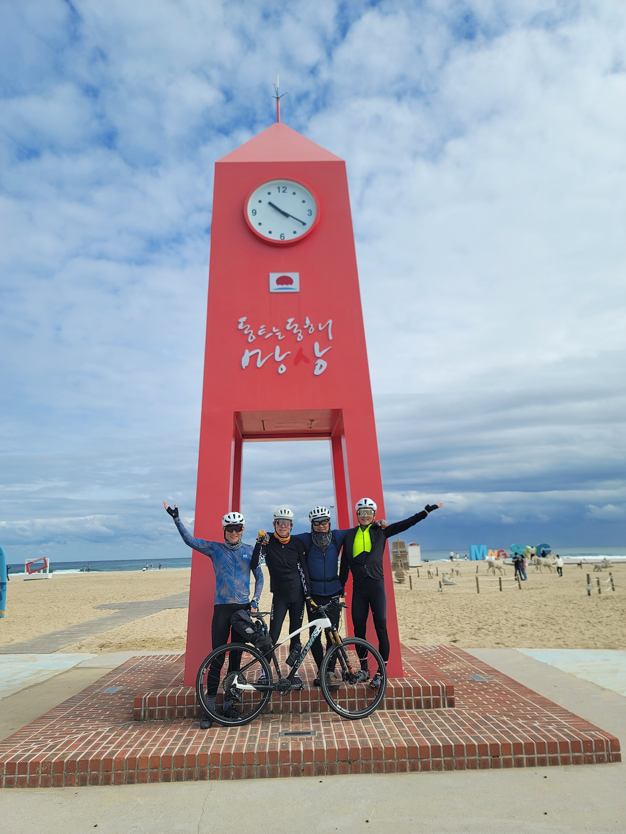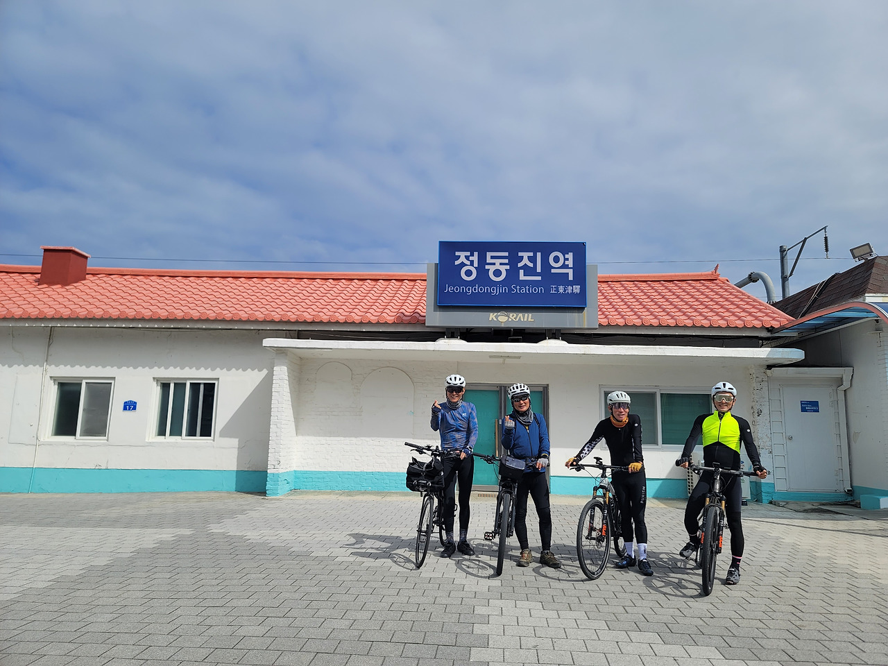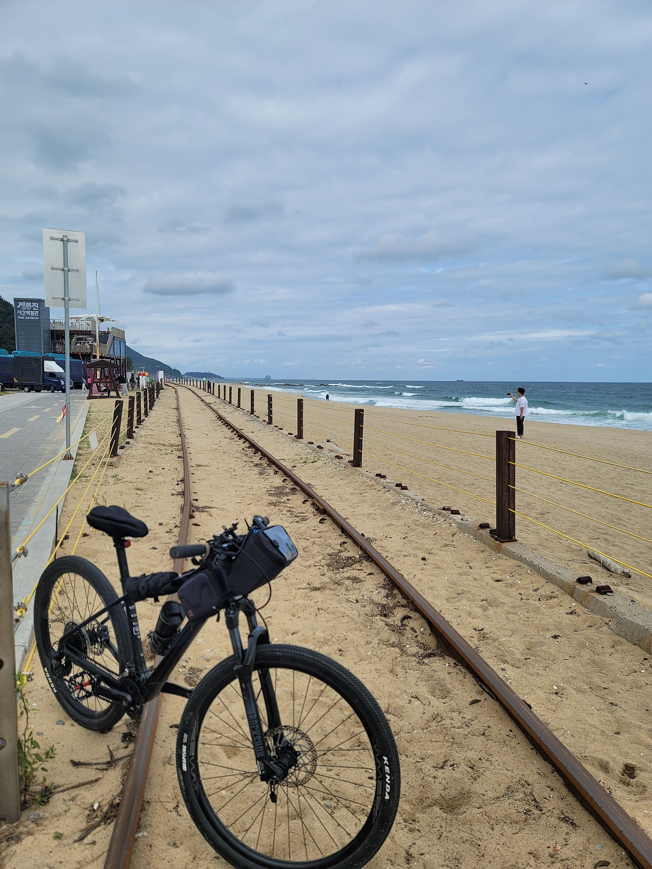 정동진으로 가는 길은 험난했다. 길을 잘못 들어 해변도로를 놓치는 바람에 도심을 따라 도로를 달려야 하는 코스가 많아 더욱 힘든 여정이었다. 다시 길을 찾았지만, 정동진 고개를 넘어가는 길은 마지막 한 방울까지 고통스러운 힘을 짜내야 했다. 끌바를 하고 쉬어가며 고개를 넘으니, 드디어 푸른 동해바다가 눈이 시리게 펼쳐진다. 여러 번 이곳을 찾았지만, 두 바퀴로 정동진에 왔다는 사실이 행복하다.