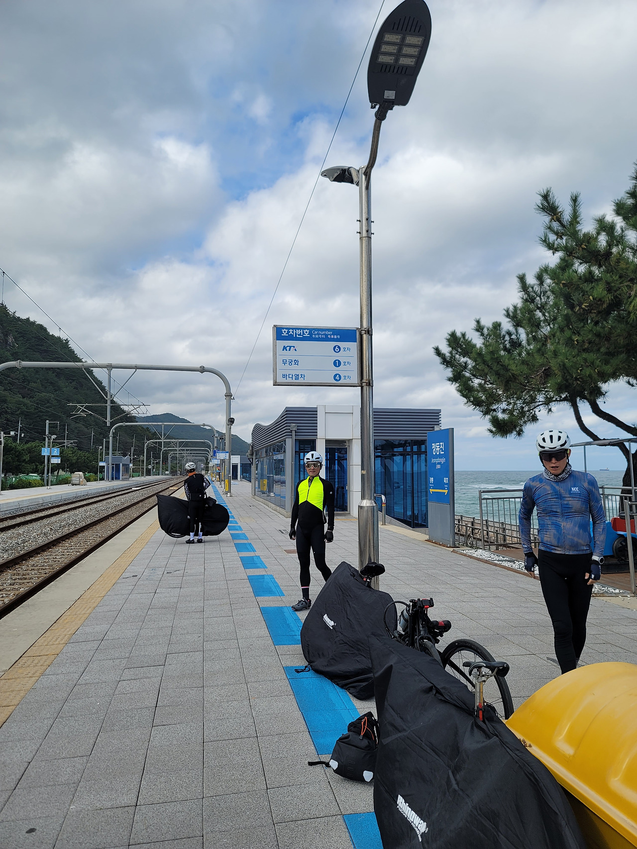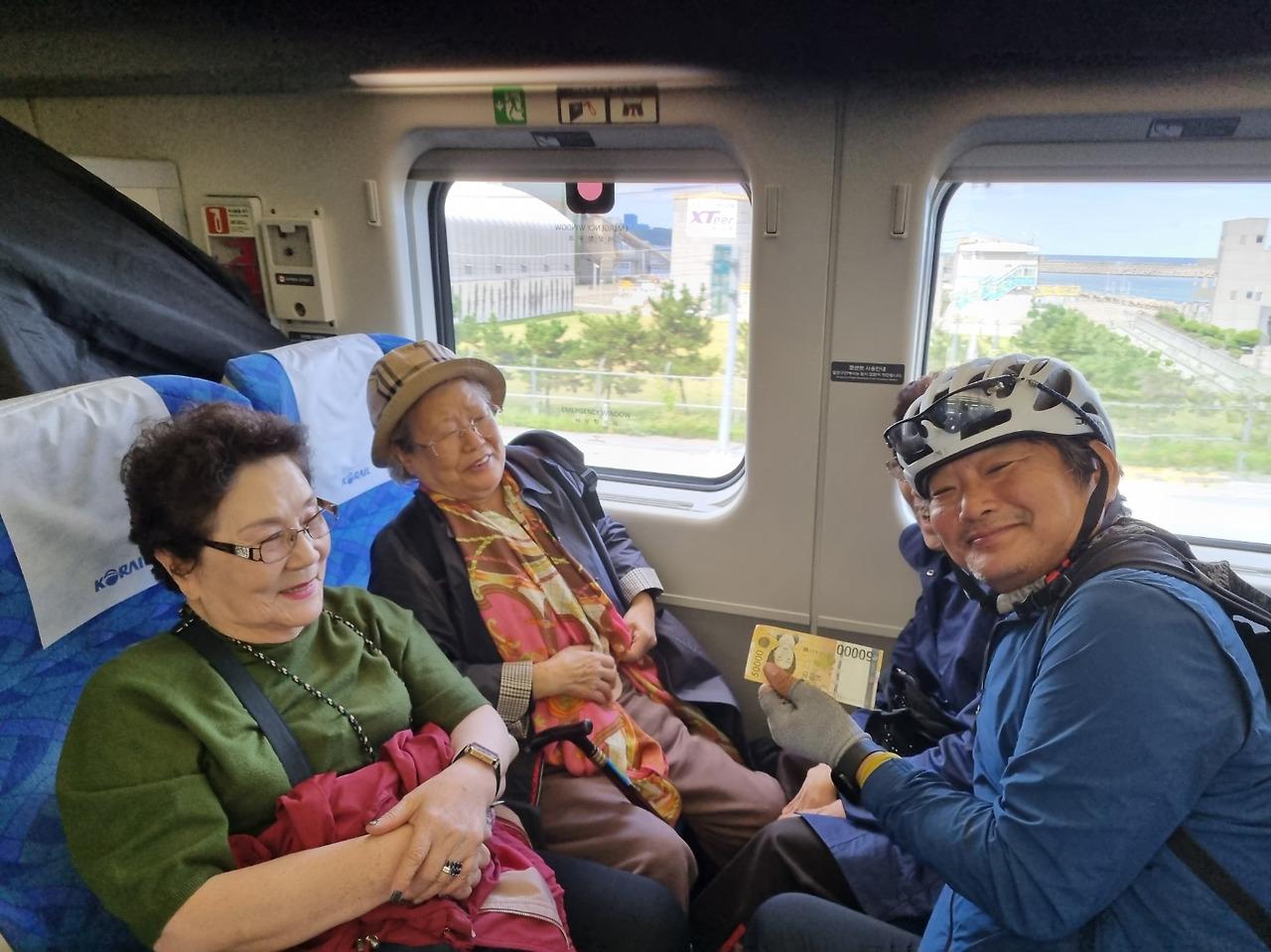 정동진역 앞 분식가게 할머니 사장님의 넉넉한 웃음과 푸짐한 인심을 먹고, 정동진역에서 동해로 가는 KTX에 몸을 실었다. 우리 옆자리에는 일흔 중반쯤은넘어 보이는 할머니, 아니 누님이라고 해야 할 분들이 앉아 있다. 인상 좋은 누님들 좌석으로 자리를 옮겨 너스레로 기차 여행을 함께했다. 같은 고향, 초등학교 동창생이라는 이들은 적지 않은 나이에도 불구하고, 시간 나는 대로 전국 여행을 함께 하고 있다 한다. 70여 년 우정이 참으로 아름답다. 우리들의 국토 대장정 얘기를 듣고 엄청 부러워한다. 한참을 웃고 떠들다가 동해역에 내릴 시간이 되었다. 인사를 하는 나에게 막걸리라도 한잔하라며 지갑에서 5만 원짜리 지폐 한 장을 선뜻 내준다. 뜻밖의 선심에 여러 번을 사양하다가, 그 마음이 고마워 끝내 받았다. 우연히 만난 사람들과의 교감이 여행의 참 맛이다. 젊은 누님들의 건강한 삶이 오래오래 지속되길 바라는 맘이다.