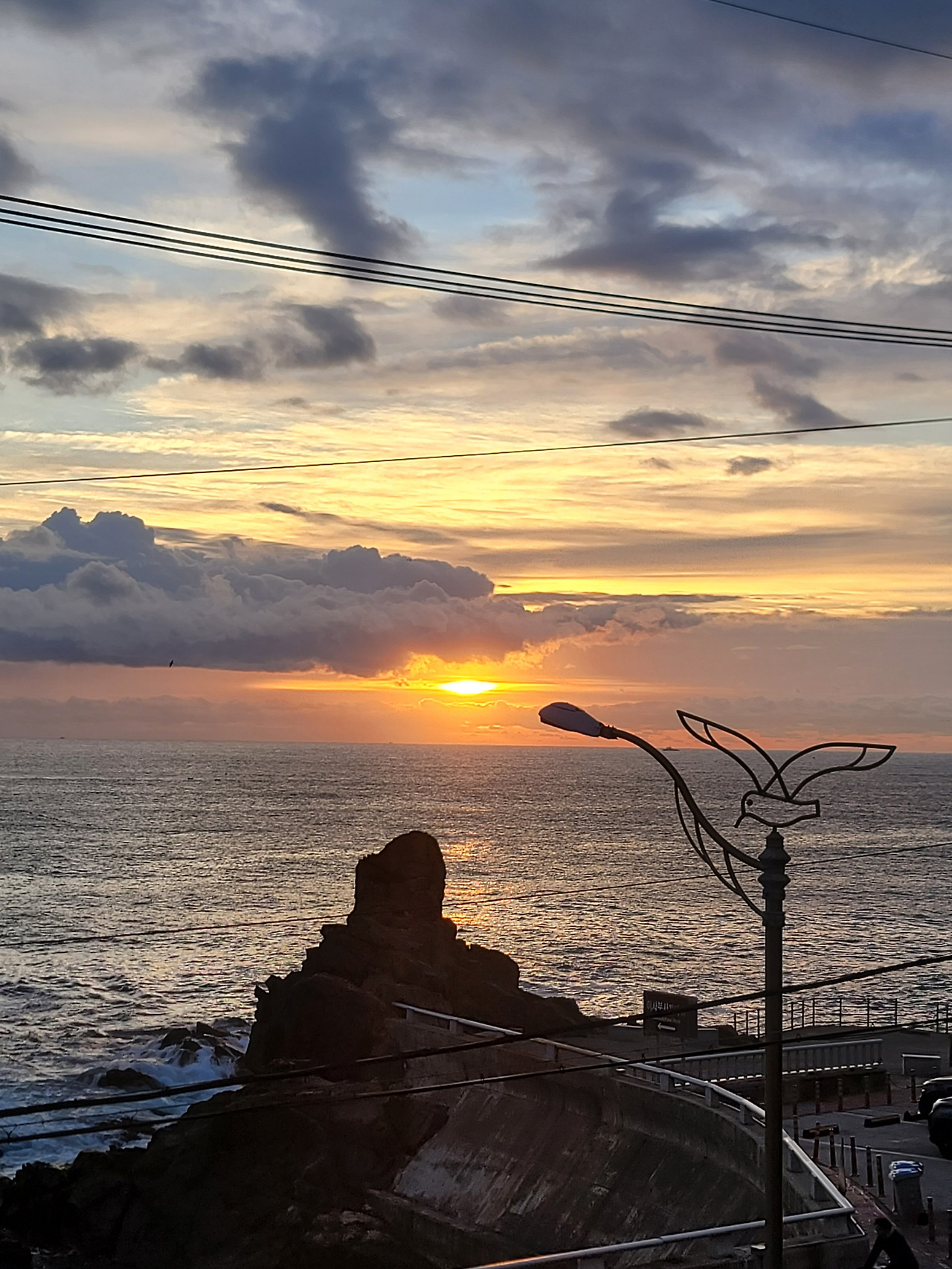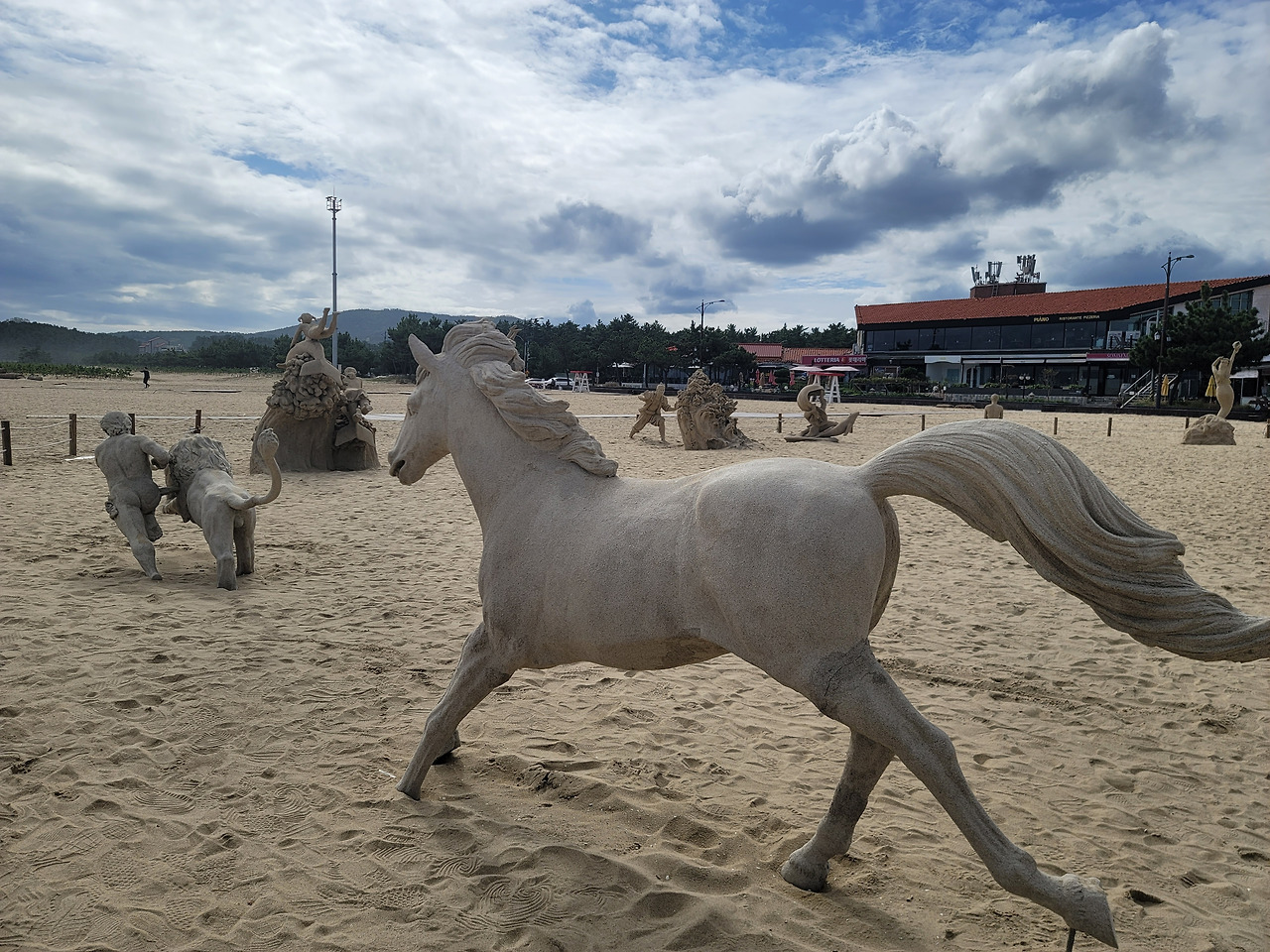 다시 20여 km를 달려 망상해변으로 간다. 철 지난 망상해수욕장에는 오늘도 꽤 많은 사람들로 북적인다. ‘동트는 동해, 망상‘이라고 쓰인 붉은 시계탑이 인상적이다. 사람들에게 인기가 많아 한참 줄을 선 뒤에야 사진 몇 장 남길 수 있었다. 모래사장에는 백마, 사자 등 모래로 만든 작품들이 눈길을 끈다.