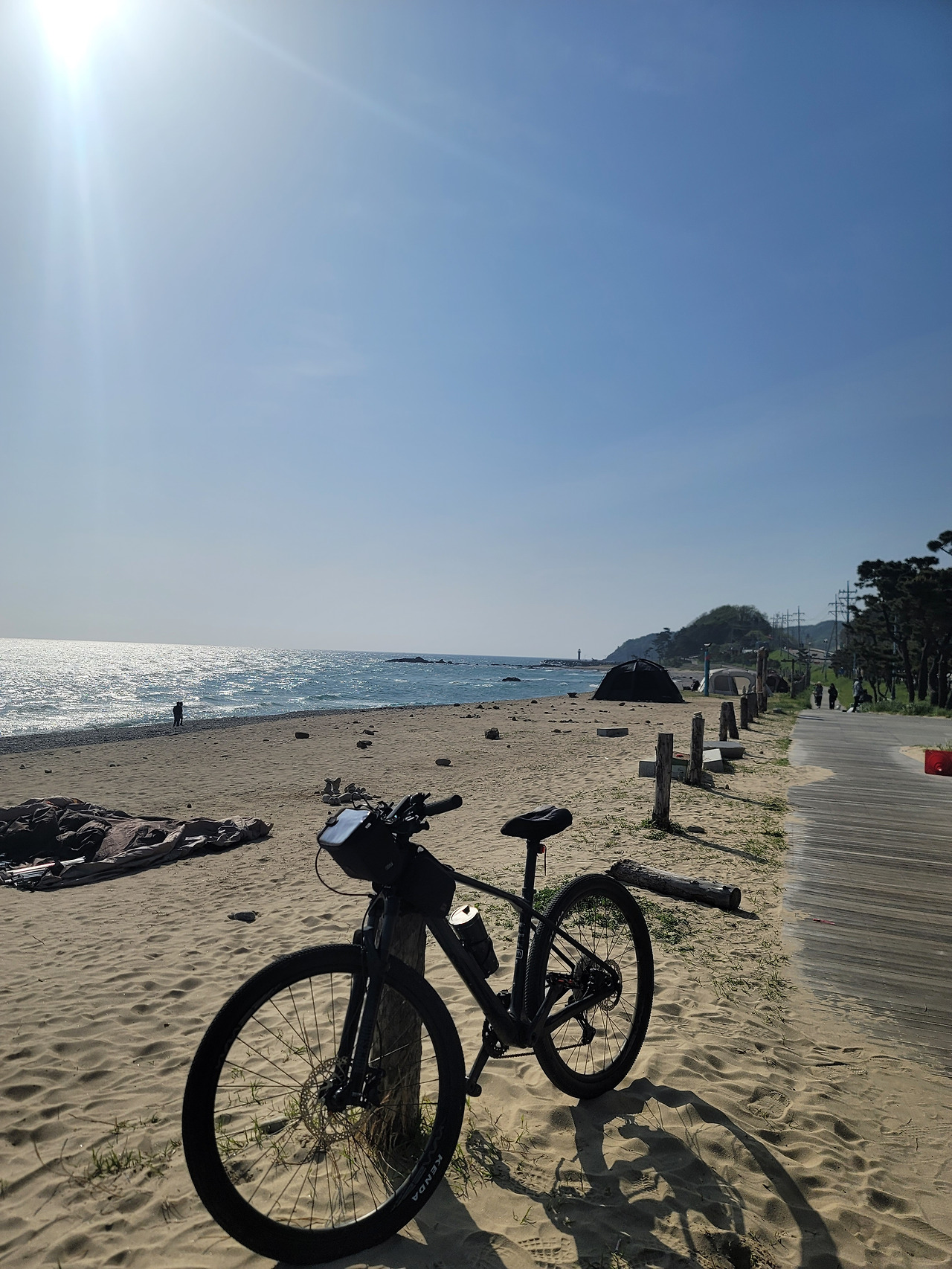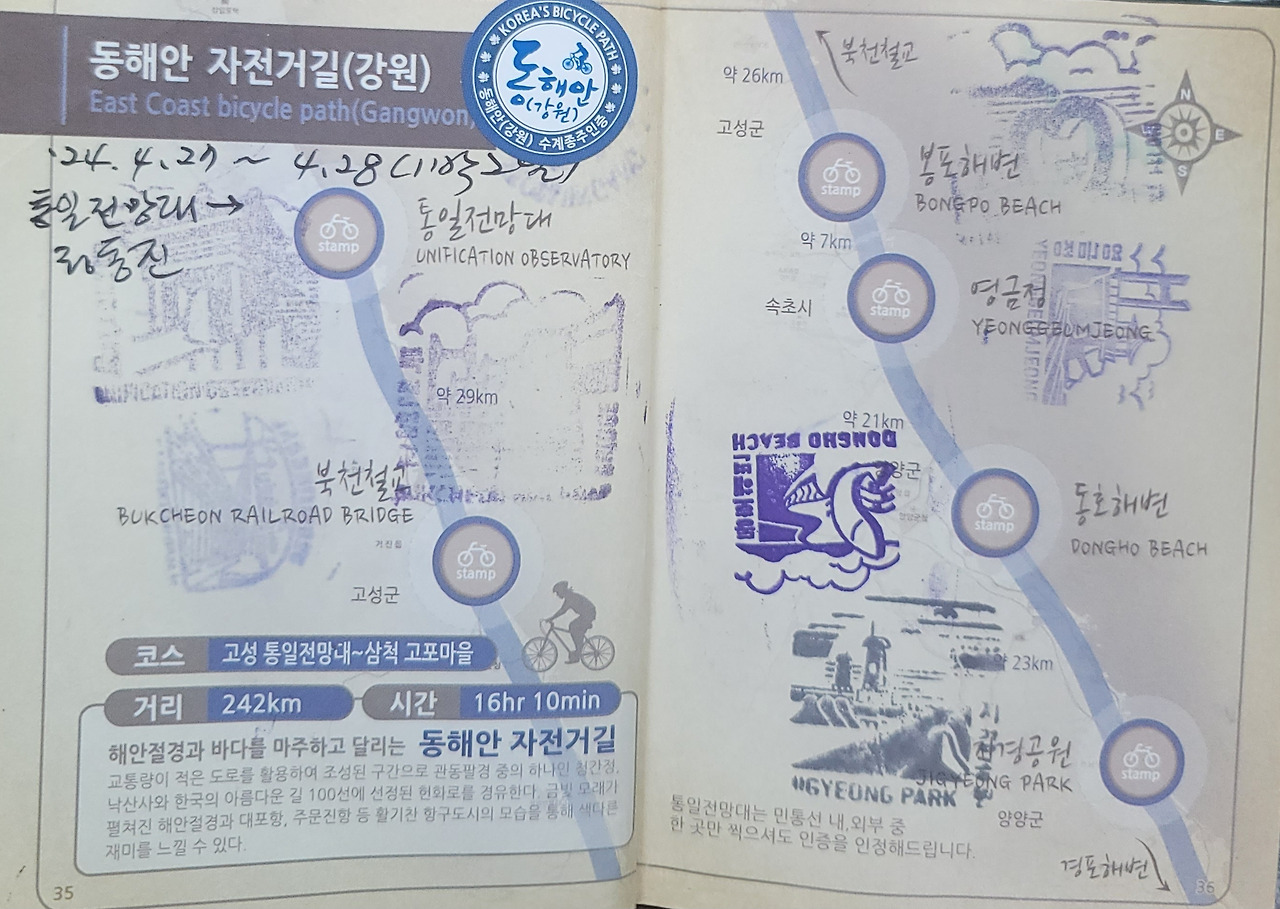 커피 한잔의 여유를 담고 페달을 밟는다. 이제 오늘의 마지막 종착점인 경포해변 인증센터까지 약 40km 밖에 안 남았다. 시간이 넉넉하다. 마음에 여유를 싣고 3·8선을 지나 지경공원에서 인증을 마치고, 주문진항을 향해 달린다.