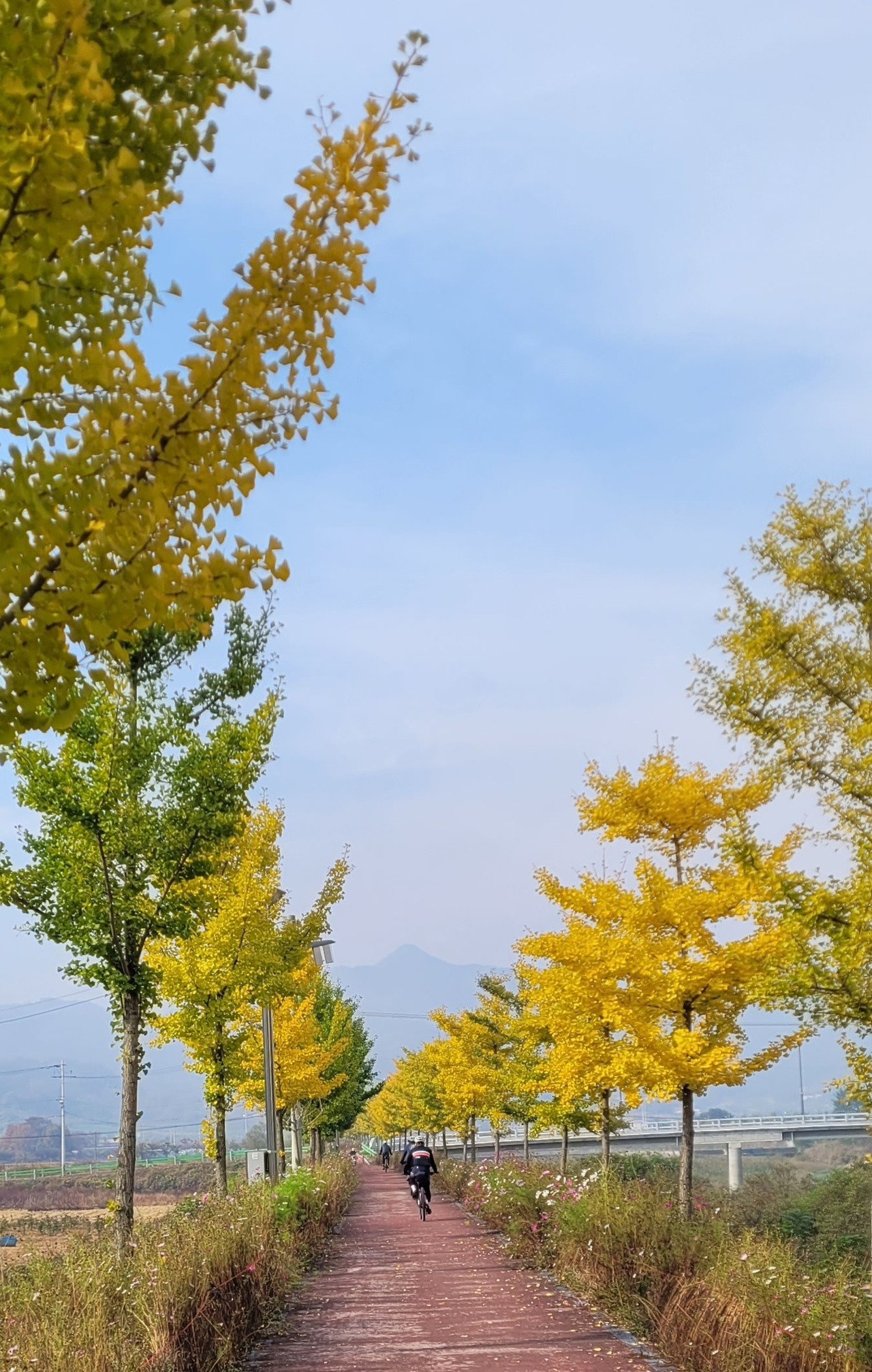 10월 하순을 달리는 들녘은 가을로 가득 차 있다. 황금 벼가 물결치던 들판이 하나 둘 추수를 마치고 빈들이 되어가고, 나뭇잎은 깊어가는 가을을 노랗게, 빨갛게 노래하고 있다. 증평 백로공원에서 인증을 하고 다시 강을 따라 달린다. 마을과 함께 군데군데 우사와 양계장이 보이면서 쇠똥과 닭똥 냄새가 진하게 풍긴다. 다들 역겨운 냄새에 소리를 지른다. 나는 가끔씩 시골길에서 만나는 이런 냄새를 향수(鄕愁)라고 부른다. 비록 누구나 좋아하는 향수(香水)는 아니지만, 어릴 적 익숙하게 맡아온 뒤엄자리 냄새와 쇠똥, 닭똥 냄새는 늘 고향을 떠올리게 한다. 그 냄새를 벗어나려고 힘차게 페달을 밟는 동료들 뒤에서 천천히 페달을 밟는다. 오랜만에 진한 고향 냄새를 맡으며 달린다.