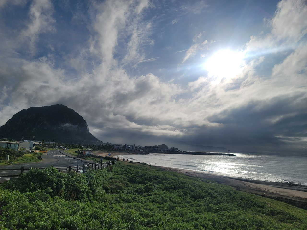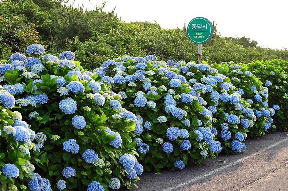 법환바당을 지나 쇠소깍을 향해 달린다. 이 구간도 상당 구간 도로를 타야 했지만, 바다를 끼고 달리니 행복하다. 특히, 길 따라 피어있는 수국이 위안을 준다. 이 길뿐만 아니라 제주의 길에는 유난히 수국이 많다. 길마다 소담스럽게 핀 6월의 꽃, 수국이 주먹 손을 흔들며 반긴다. 파랑, 보라, 분홍, 하양 등 갖가지 색과 향이 은은하게 펼쳐진 수국의 길을 눈과 코로 즐기며 달린다. 제주의 6월은 수국 천지다.