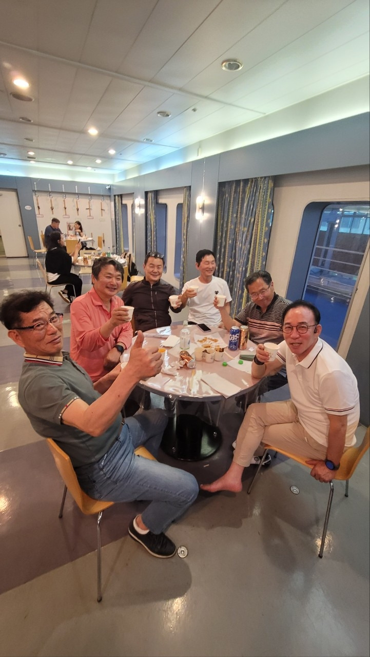 객실로 돌아왔다. 우리 열혈청춘들만의 시간이 왔다. 선실에 조금은 불편한 자리를 깔고, 소주파티를 열었다. 떠나기 전 넉넉하게 준비한 소주가 놓이고, 저녁식사 때 식당에서 종이컵에 담아 온 안주거리를 펼치니 나름 진수성찬이다. 처음 맛보는 밤바다 해외여행이 우리를 들뜨게 한다. 모두들 평소보다 잔의 움직임이 빠르다. 오늘의 행복을 나누고, 내일의 기대를 담은 왁자한 웃음소리, "열혈청춘만세 파이팅!" 구호와 함께 첫날밤이 익어간다.