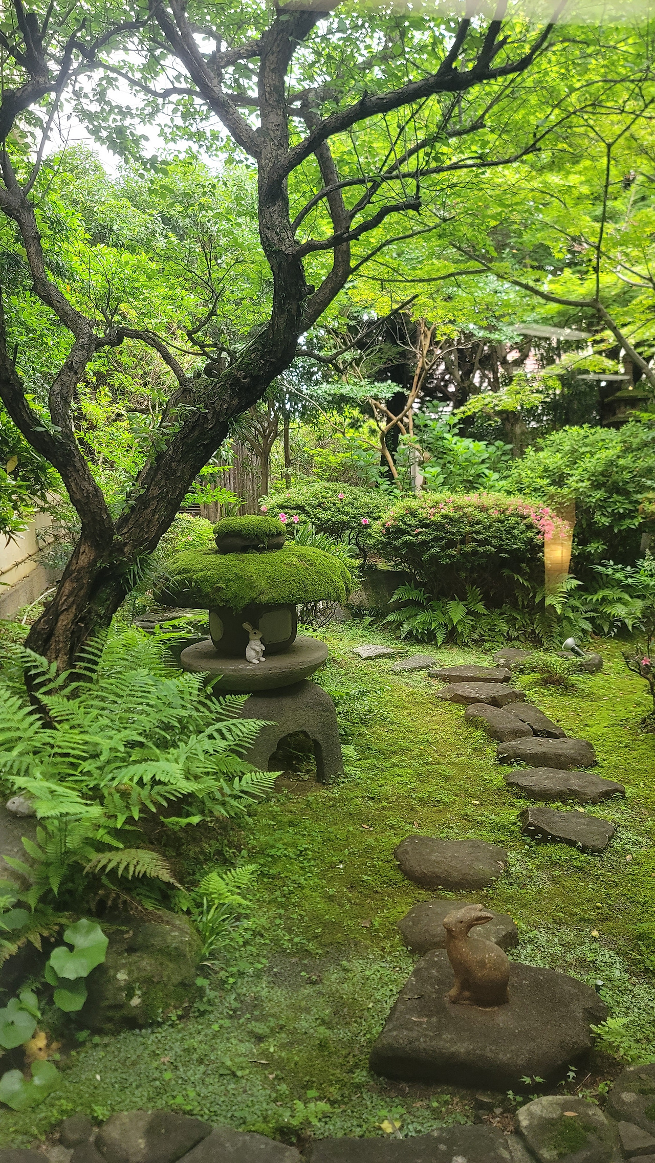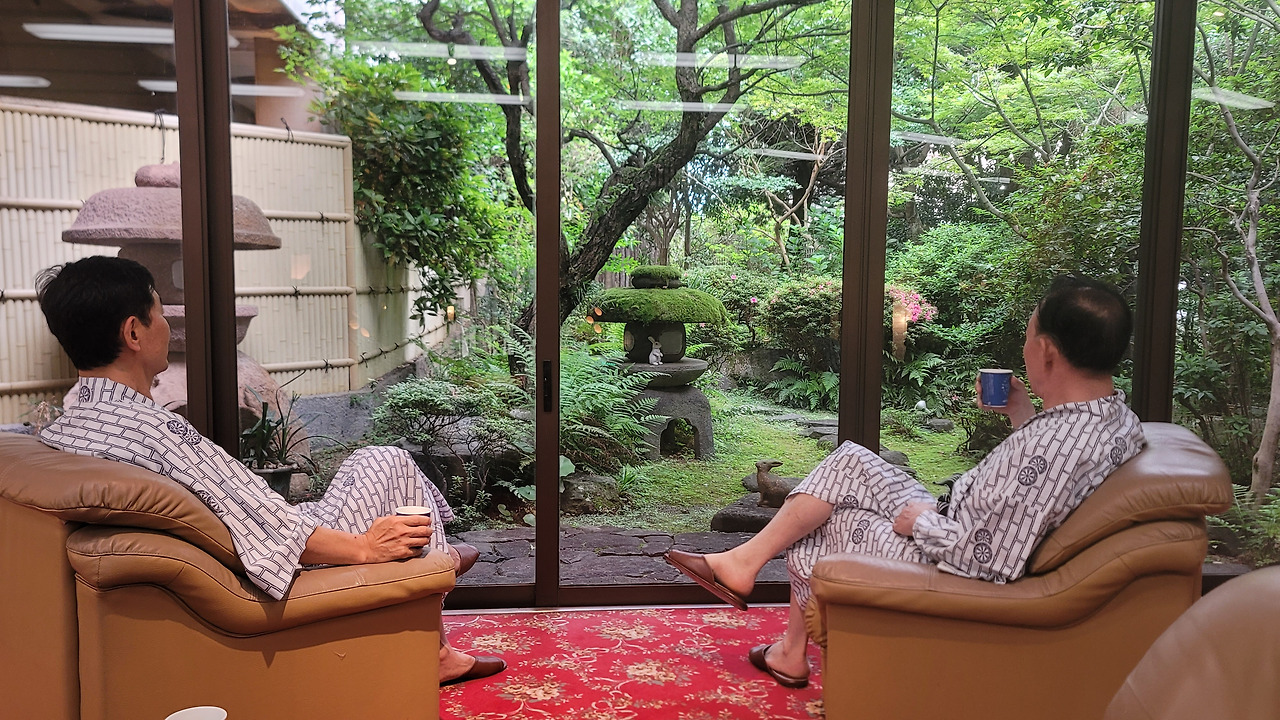 료콴(旅館) 1층 앞마당에 자리한 자그마한 정원이 아름답다. 1,000여 년의 역사를 자랑하는 일본 정원 문화는 인공적인 장식을 피하고 자연경관을 강조하며, 자연과 철학적 사상을 담은 다양한 형태로 발전해 왔다 한다. 한 바퀴 둘러보고 소파에 앉아 차 한잔 즐기며 통창 너머로 바라보는 정원이 하루의 피로를 덜어준다.