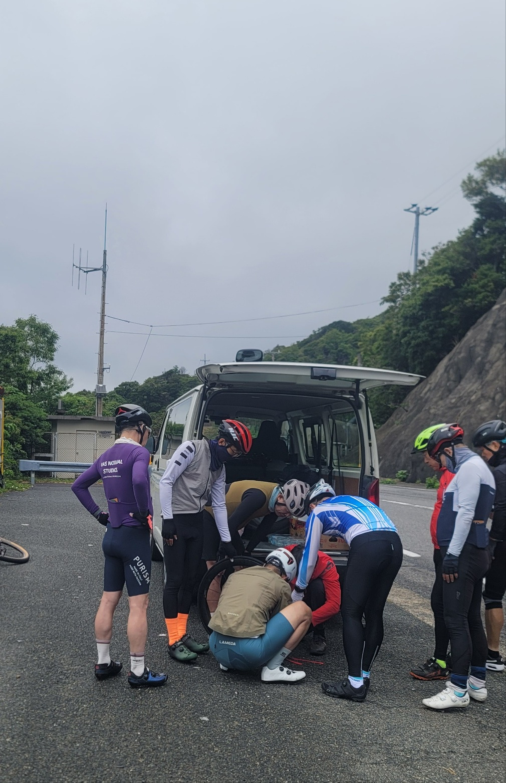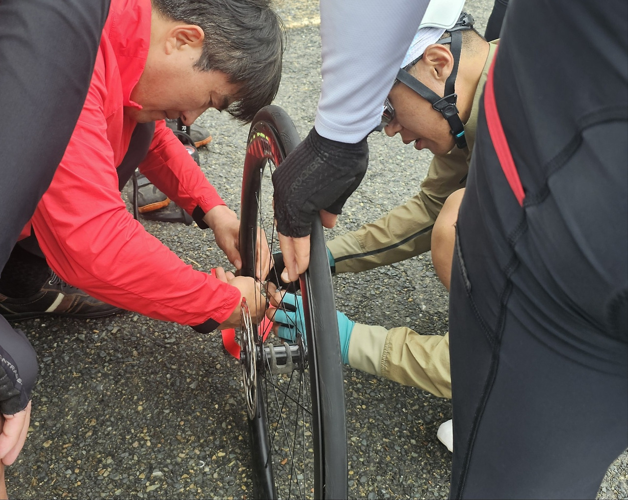 얼마를 달리다가 경주에서 온 젊은 라이더의 자전거에 또 다른 사고가 났다. 체인을 받쳐주고 기어 변속을 도와주는 부품 일부가 파손되는 일이 발생했다. 또, 우리 열혈청춘 맏형의 자전거 타이어가 펑크 났다. 연이어 발생한 작은 사고가 동료 라이더들의 수심을 깊게 한다. 펑크는 준비해 간 스페어타이어로 바로 교체했지만, 기어변속 장치의 고장은 끝내 수리하지 못하고 말았다. 큰맘 먹고 멀리 이국 땅까지 온 라이더에게 자전거 고장은 참으로 난감한 일이다. 결국 그는 차량에 자전거와 함께 승차해야만 했다. 자전거 라이딩은 작고 큰 사고가 숨어 있다. 조금만 방심하면 사고로 이어지기 십상이다. 사고 없는 라이딩이 우선이다.
