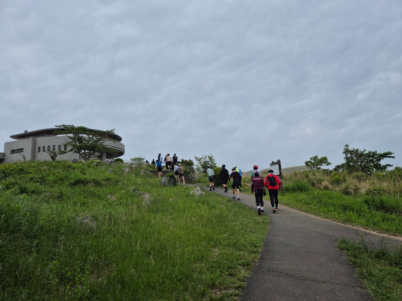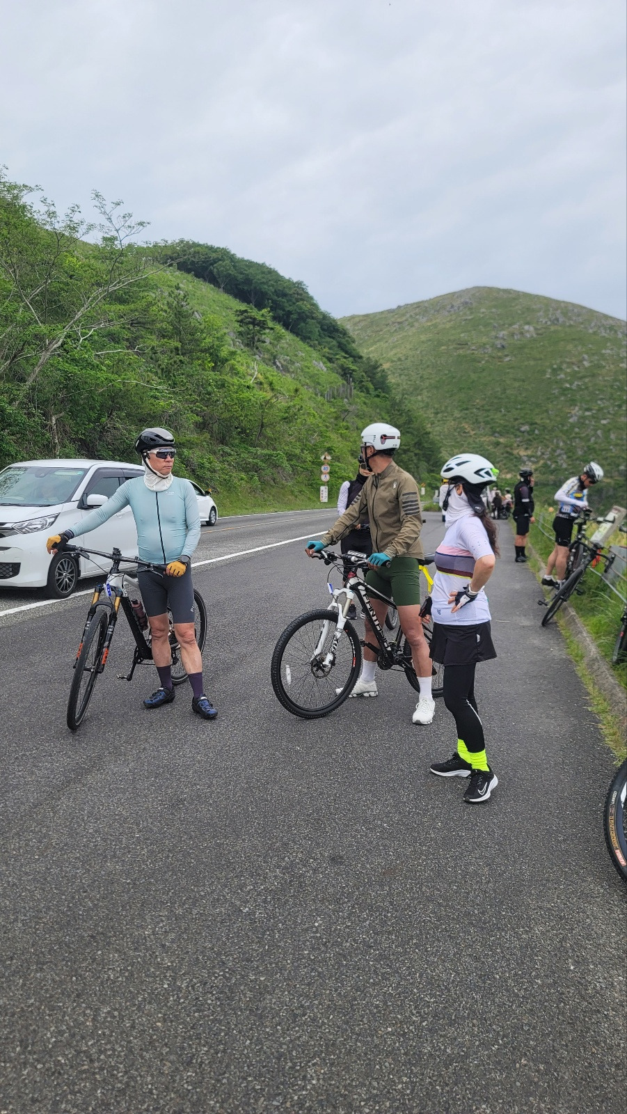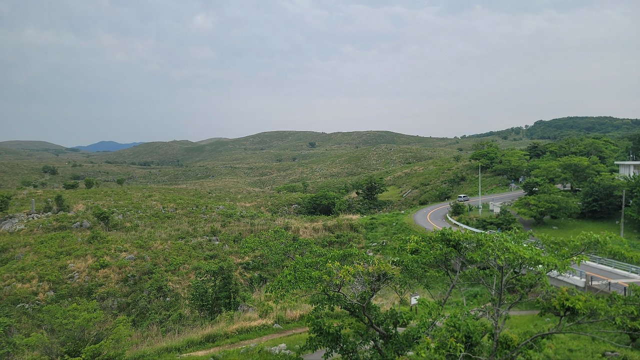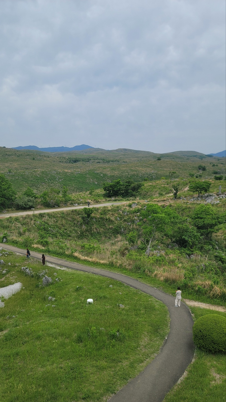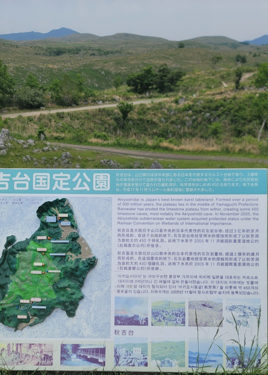 바다를 벗어던진 길이 본격적으로 내륙 산간으로 들어선다. 지금 우리 행렬은 아키요시다이 국립공원을 향하고 있다. 서서히 경사가 급해지면서 이제까지와는 전혀 다른 풍경이 나타난다. 그 흔한 나무 하나 보이지 않는 민둥산 언덕들이 완만한 굴곡을 이루며 광활하게 펼쳐진다. 아키요시다이 국립공원에 들어선 것이다. 굽이굽이 굽어진 길이 뱀처럼 산을 휘감고 기어오른다. 만만치 않은 오르막을 헐떡이는 숨을 몰아쉬며 페달을 밟는다. 한달음에 가기엔 무리다. 두 번을 쉬고, 여러 개의 고개를 넘어서야 정상 전망대에 도착했다. 입구에 한글과 영어, 중국어로 된 안내판이 눈길을 끈다. 이곳은 일본의 대표적인 카르스트 지형으로, 3억여 년에 걸쳐 만들어진 450여 개의 종유굴이 있어 람사르 습지로 등록되어 있다고 설명하고 있다.
