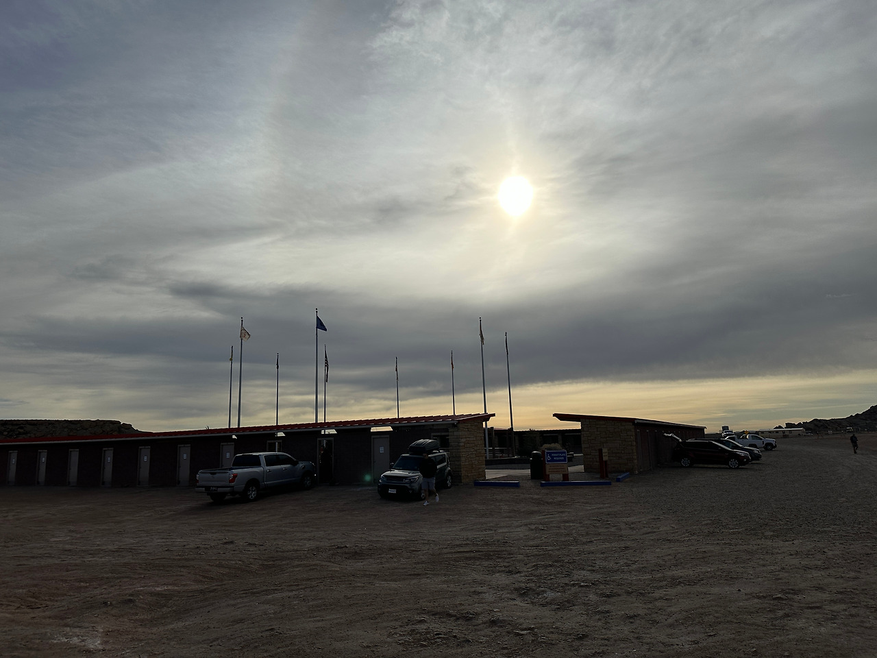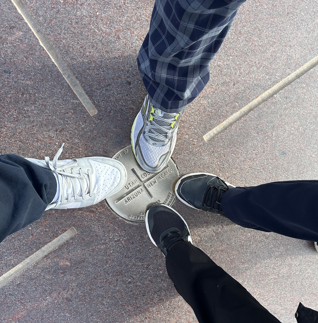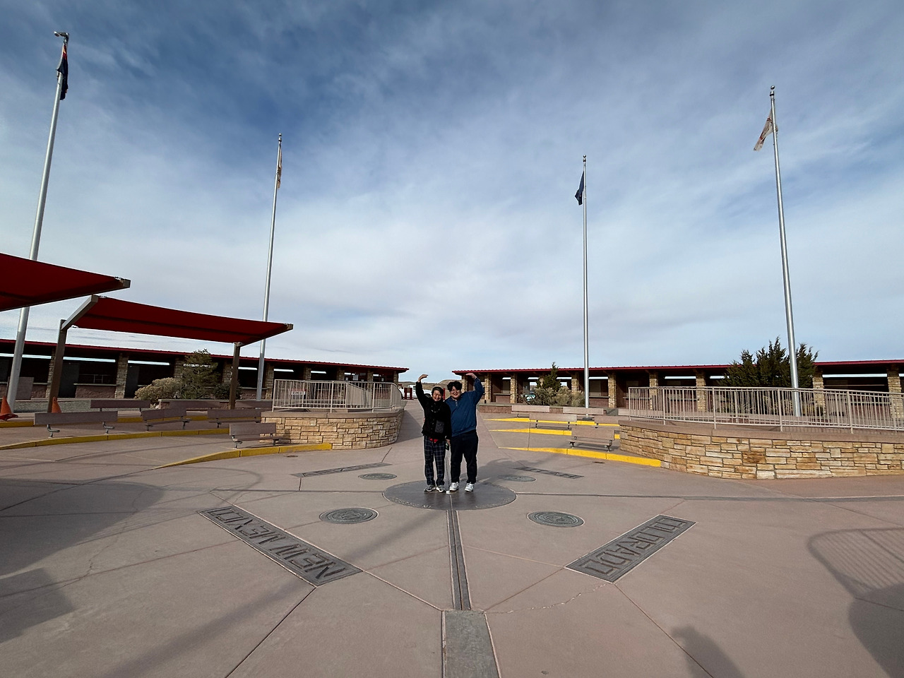 이곳 모뉴먼트 상징물이 정 가운데에 위치해 있다. 각 주를 상징하는 4개의 깃발이 펄럭이고, 바닥에는 둥근 원판에 각 주의 영역표지가 박혀있다. 바닥 지표를 따라 한 바퀴를 돌면, 단 몇 초만에 네 개의 주를 한꺼번에 밟을 수 있다. 한 바퀴 돌고 나니, 콜로라도를 시작으로, 유타, 애리조나를 거쳐 이곳까지 온 우리 가족의 여행길을 상징하는 듯 한 느낌이 들었다. 넷이서 각자 한 개 주의 땅을 밟고, 기념사진 몇 장 남기고 나니 20년 전 풀지 않은 숙제를 마친 듯이 홀가분하다.