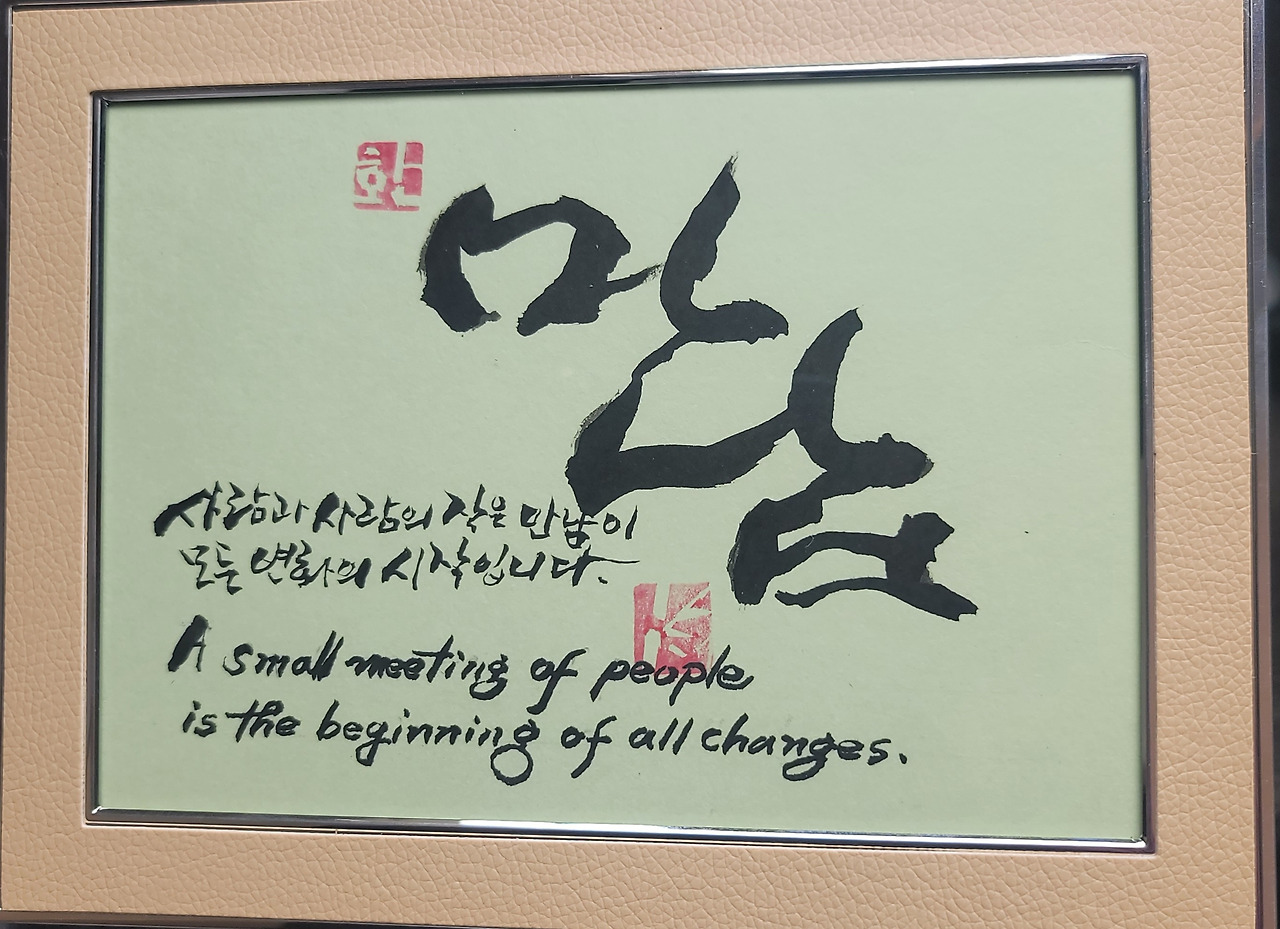 하나는 20년 전 크리스마스 날, 그분들이 우리 아이들에게 선물을 주던 순간을 담은 사진 액자이다. 20년 전 젊은 모습을 본 두분은 깜짝 놀라며, 미국인 특유의 제스처와 함께 행복해 했다. 또 인사동에서 구입한 한국 고유의 접이식 부채와 내가 캘리그래피로 직접 쓴 '만남'이란 액자도 선물로 드렸다. 액자에는,