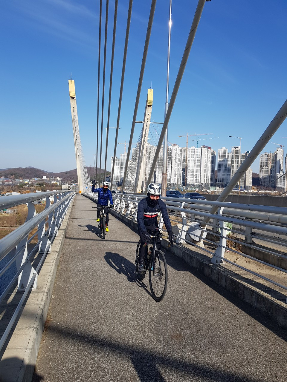 도심을 따라 축복처럼 흐르는 강을 끼고 ‘뚝섬 전망문화콤플렉스 인증센터’를 거쳐 광나루를 향해 달렸다. 광나루 인증센터에서 마지막 인증을 하고 나니, 어느덧 해가 서녘으로 기울고 있다. 점심도 거르고 달려온 열혈청춘의 국토대장정 첫 라이딩은 여기서 마무리하기로 했다. 우리가 자주 찾는 암사역 근처 꺼먹돼지 맛집에서 첫 라이딩을 자축했다.
