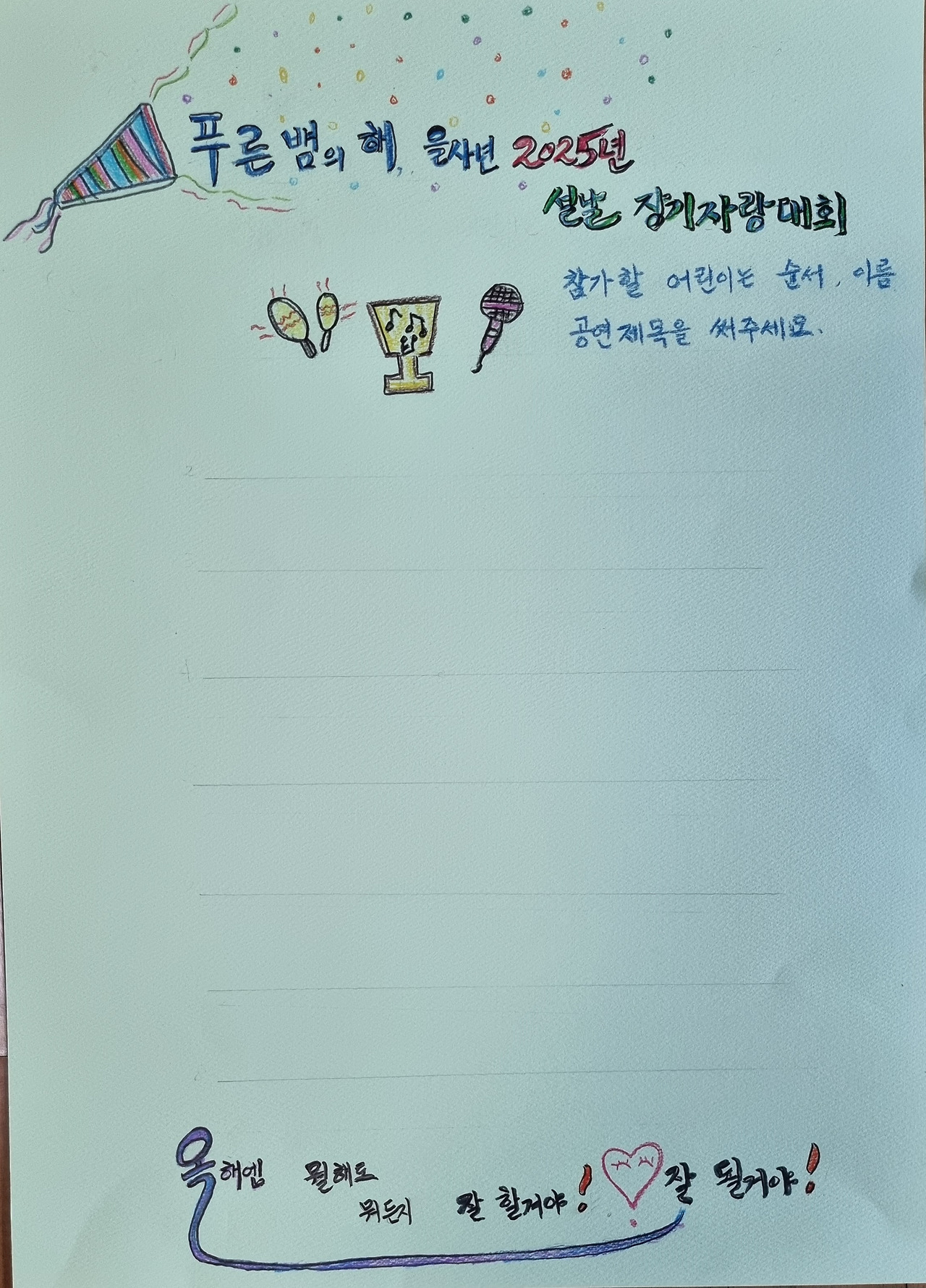 이번 2025년도에는 나의 아이디어 공장에 다시 한번 시동이 걸렸다. ‘포스터에 공간을 남겨 두자! 어른인 할머니가 모두 채워 넣는 것이 능사가 아니지! 아이들과 함께 만들어가는 과정이 더 중요하지!’라는 생각이 번쩍 들었다. “여기에 자기가 출전할 순서, 이름과 공연 제목을 직접 써넣어.”라고 말하자, 그 생각만으로도 왁자지껄 웃음이 터져 나온다. 딸도 이런 엄마 아이디어가 놀랍고 제일 재미있단다. 애들은 명절 전에 간간이 만났을 때, “할머니? 나는 이런 공연을 준비하고 있어요.”라며 언질을 주었다. 그렇지만 이렇게 풍성하게 준비하고 있는지는 전혀 몰랐다. 효과는 대단했고 서로 눈치 보며 순서 짜는 모습이 가관이었다.