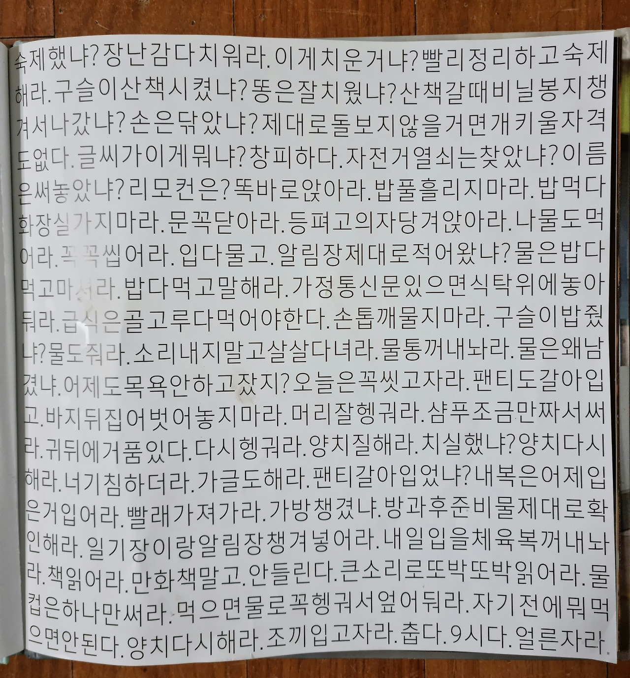 나는 손자한테 스톱워치를 주며 빽빽한 한 페이지 글을 천천히 또박또박 읽었다.