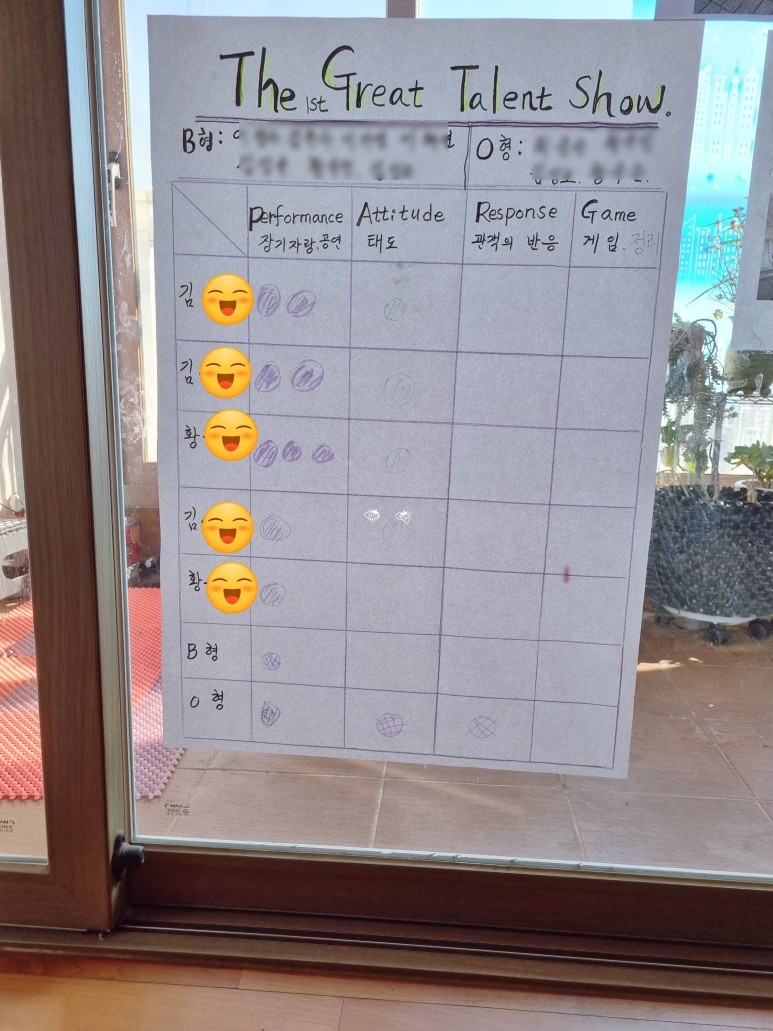 5살 손녀는 다른 관객들의 반응에는 전혀 신경 쓰지 않고 그녀 특유의 내공으로 병원놀이도 보여 주고 인형으로 육아하는 모습도 보여줬다. 3살 손녀는 자기 집에서 그렇게 열심히 연습하더니 정작 발표 시간에는 도망쳐버리는 해프닝이 벌어졌다. 제일 걱정이 많은 7살 손자는 알아듣지도 못하는 중국어를 한다고 날마다 외우고, 두 번째 공연은 태권도 자세를 크게 외친다. 처음으로 여러 사람 앞에서 혼자 큰 소리로 하니 어색하고 멋 적어서 큰 눈을 깜빡깜빡하며 터져 나오는 눈물을 삼키면서도 끝까지 다 마치고 엉엉 우는데 정말 감동적이었다. 이 모습을 지켜본 할머니도, 이모도 숨죽이며 함께 울었다. 엄마는 대단하다며 으스러지게 안아주고 감동하여 울었고 다시 한번만 더 보여 달라고 애걸복걸했다. 특히 우리 손주들 자주 만나지 못한 이모부 앞에서 장기 자랑을 하는 것은 더 힘들었을 거 같다.