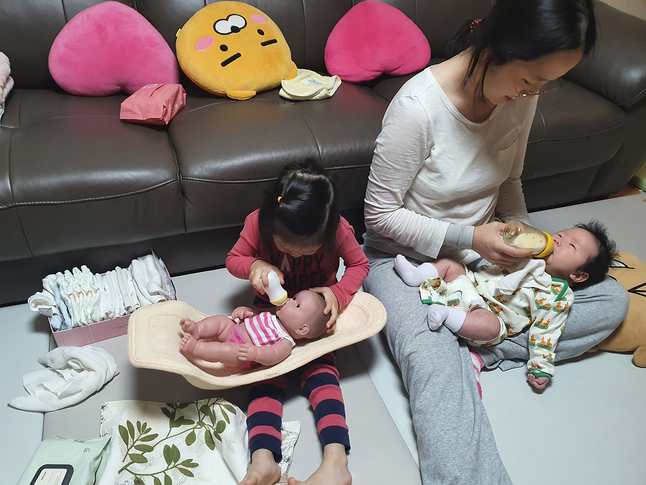 그때는 거들떠보지도 않고 치우라고 울면서 난리난리 쳤었는데 언젠가 유용하게 쓰일 날이 있다는 이모 말 듣고 잘 보관해 두었던 것이 이렇게 좋은 장난감이 될 줄이야 꿈에도 생각 못 했다. 막상 동생이 태어날 때쯤 엄마 옆에서 인형 옷 입히고, 기저귀도 갈아주고, 우유 먹이고 트림시키는 것까지 자주 연습하더니 이런 자세가 나왔다.