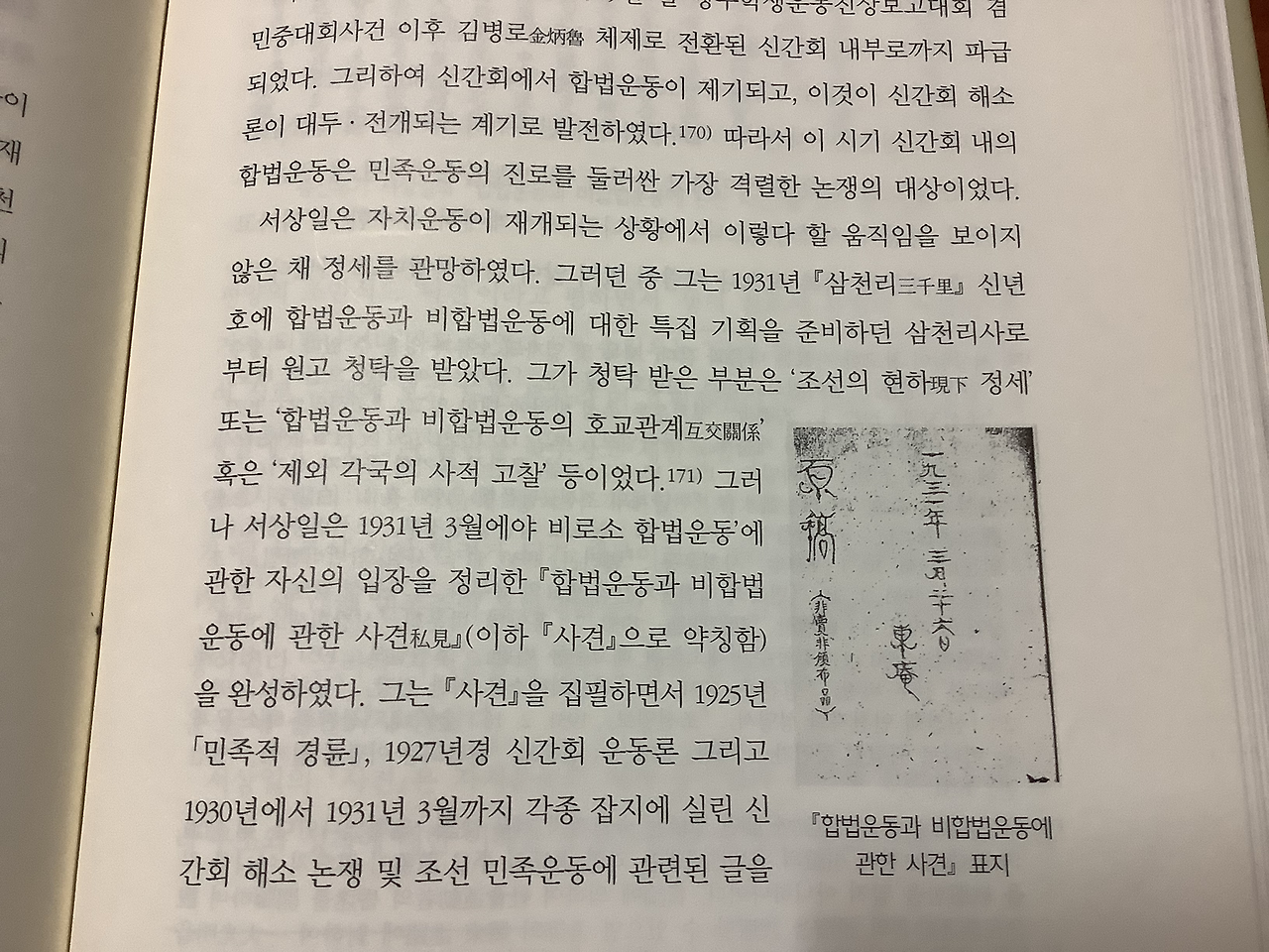 서상일은 1931년 <합법운동과 비합법운동에 관한 사견(미출간)>을 통해 신간회의 이론과 역량부족, 간디와 같은 지도자의 부재를 지적하며 “혁명과 비합법적 활동과 합법적 활동과의 관계는 혁명은 투쟁의 목표가 되고, 비합법적 활동은 급진이나 좌경이라 할 것이고, 합법적 활동은 완진이나 우경으로 볼 수 있다. 그러나 이 우경.완진..후퇴는 항상 그 좌경.급진.전진을 전제로 하는 것”이라고 주장하였으며, 이 문건을 받아본 송진우, 백남수, 고원훈 등은 그 뜻이 넓고 높음을 칭송하였고 조만식은 탁견이라며 “생의 진로에 유일의 지침과 선거가 되겠나이다”라고 하였다.