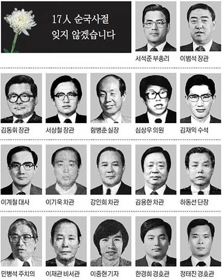 아웅산묘소에서 북한의 폭탄테러로 순국한 한국 최고의 인재 17분의 성함은 다음과 같다. 서석준 부총리, 이범석 외무부장관, 김동휘 상공부장관, 서상철 동자부장관, 함병춘 대통령비서실장, 이계철 주 버마대사, 김재익 경제수석비서관, 하동선 해외협력위 기획단장, 강인희 농수산부 차관, 김용한 과기처차관, 심상우 민정당 총재비서실장, 민병석 대통령 주치의, 이재관 대통령 공보비서관 , 이중현 동아일보 사진기자, 한경희 경호원, 정태진 경호원, 이기욱 재무부차관.