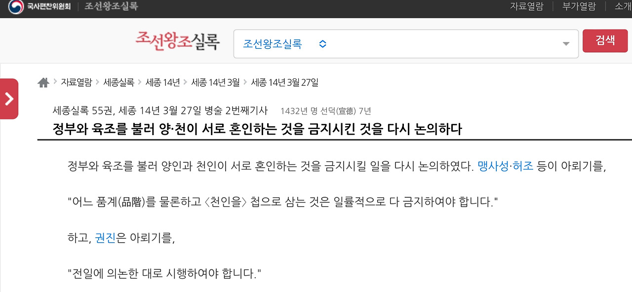 "어느 품계(品階)를 물론하고 〈천인을〉 첩으로 삼는 것은 일률적으로 다 금지하여야 합니다."