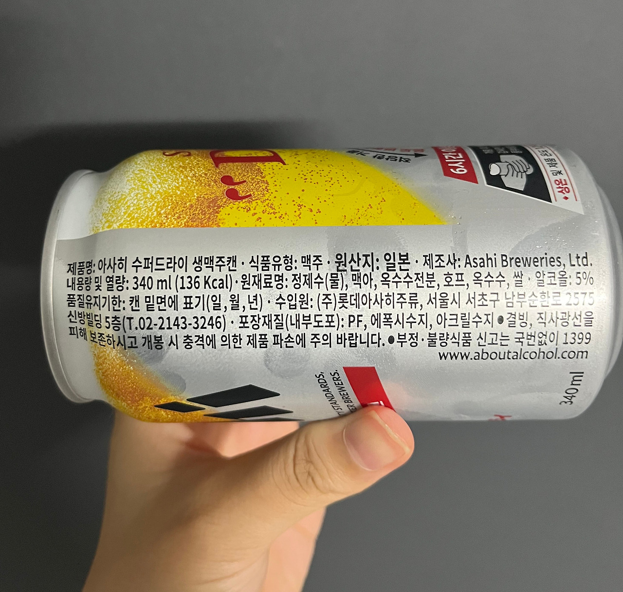 시원하다. 캔을 보기만 해도 시원한 느낌이 가장 먼저 든다. 생맥주를 표현한 맥주의 모습과, 기존의 아사히 캔의 모습이 대각선으로 나뉘어 있으며, 위에서부터 아래까지 여러 필체와 여러 색으로 글이 쓰여 있음에도 그리 난잡하다는 느낌은 들지 않는다.
