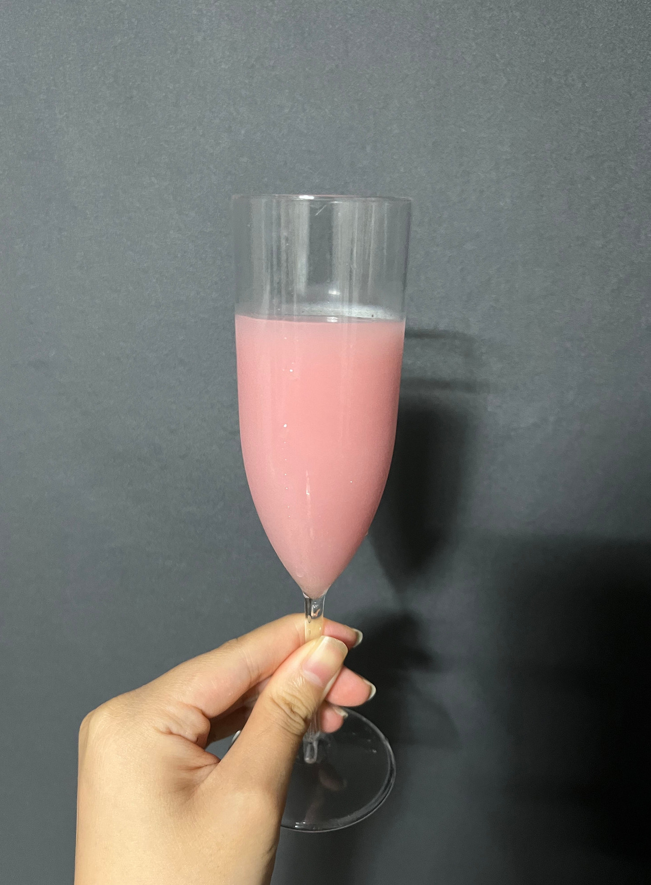 막걸리를 열심히 흔들었더니 잔에 따른 술은 매혹적인 분홍빛을 선보인다. 얼핏 보기에도 굉장히 부드러워 보이는 질감을 가지고 있으며, 예상했던 것보단 약간 옅은 색감을 보여준다.