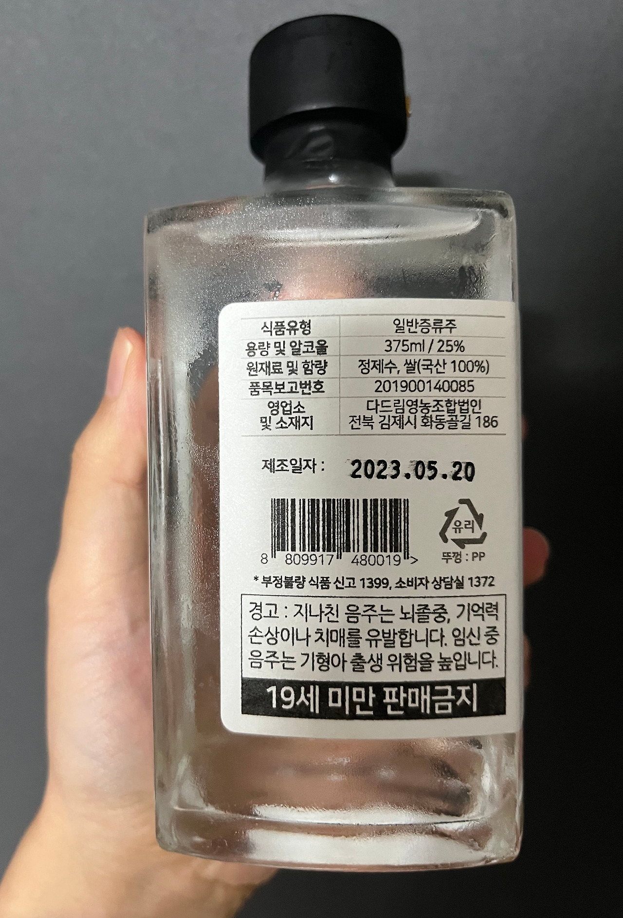 이 매력적인 술의 용량은 375ML, 도수는 25%, 가격은 18000원이다. 보통의 술 한 병이라고 치부하였을 땐 비싸다고 말할 수 있으나, 다들 알다시피 요즘 나오는 증류주들의 값이 어마무시하기 때문에 맛을 본 다음에 판단하도록 하겠다.