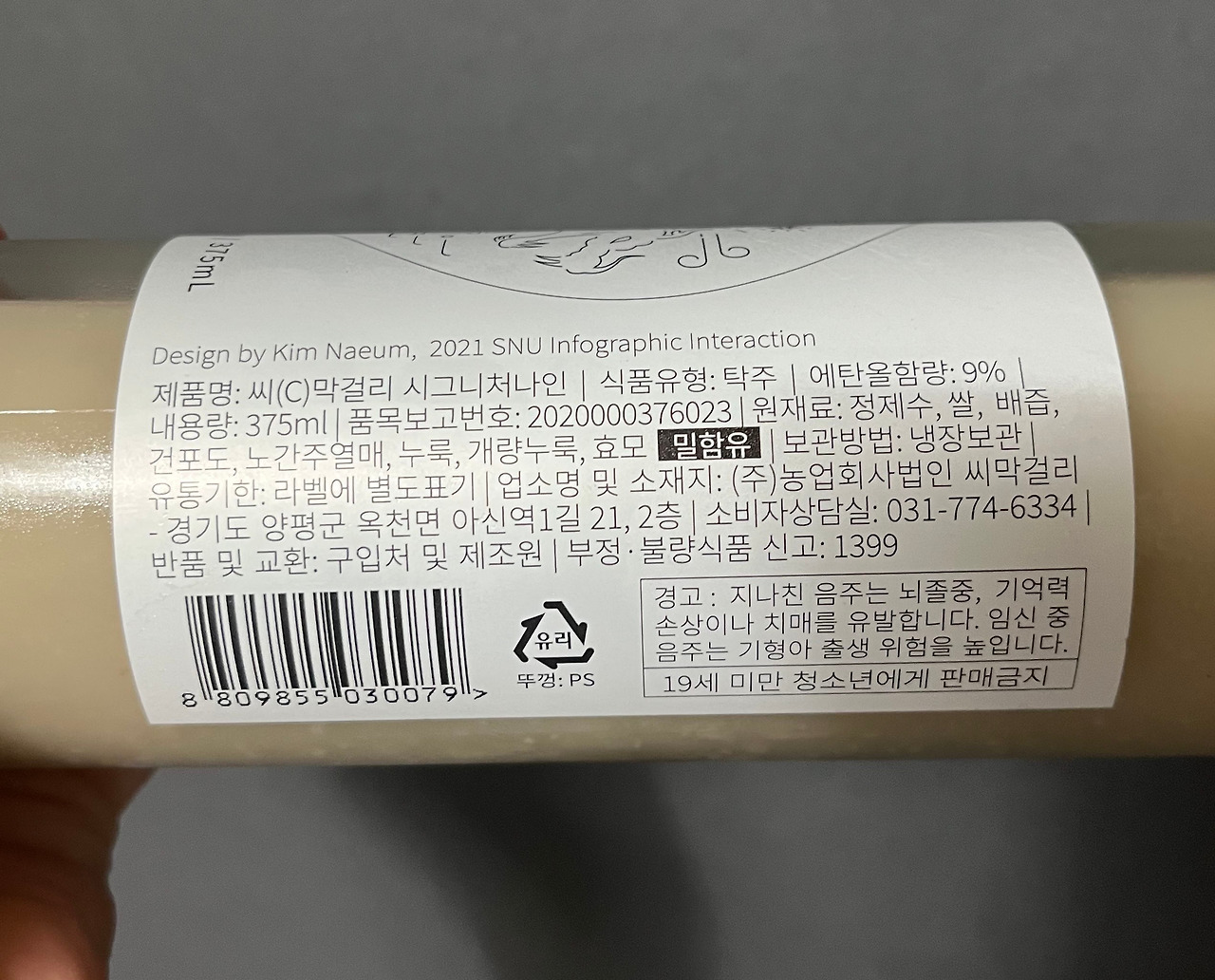 재료만 보아선 어떤 맛이 나타날지 짐작할 수 없는 이 막걸리의 용량은 375ML, 도수는 9도, 가격은 13,000원이다. 현대적인 디자인 막걸리답게 가격 역시 현대적인 모습이다. 375ML 막걸리 한 병의 가격이 13,000원. 언제 이렇게 고물가 시대가 된 것인지. 물론 가격에 대한 판단은 언제나 그랬듯이 맛을 본 후에 할 것이다.