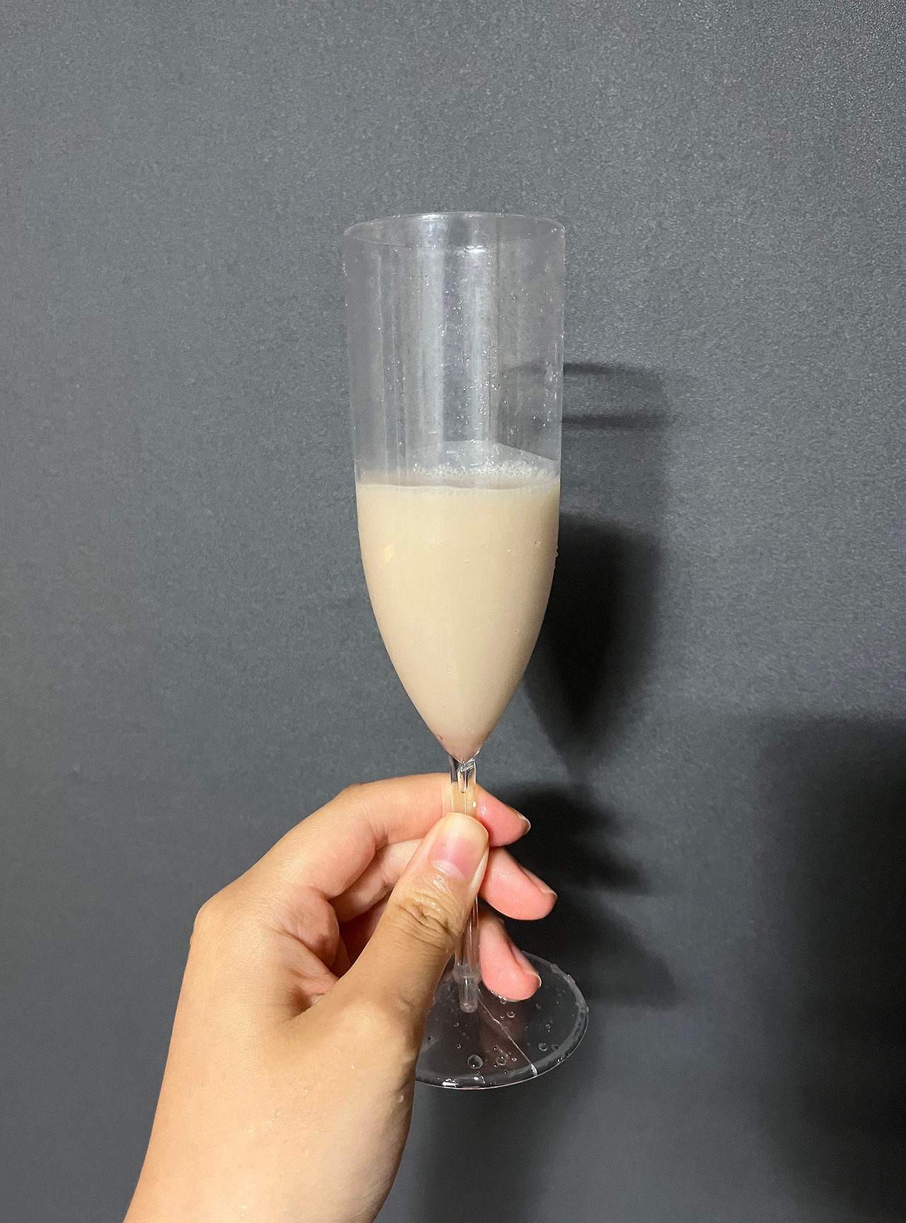 잔에 따른 술은 아이보리 색깔을 선보인다. 보통의 막걸리에 비해 좀 더 진하고 걸쭉해 보이는 느낌이 있고, 누르스름한 빛깔은 마시기 전임에도 기대를 하게 만든다.