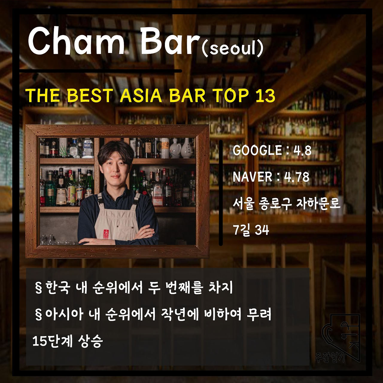 다섯 번째는 아시아 내에서 13위를 차지한 'Cham Bar'이다. 구글 기준 4.8, 네이버 기준 4.78로서 평점만 보아도 다른 바들에 비하여 상당히 높다는 것을 알 수 있다. 서울 종로구에 위치하고 있으며, 아시아 내 순위에서 작년에 비하여 무려 15단계나 상승해 13위를 기록하게 되었다.
