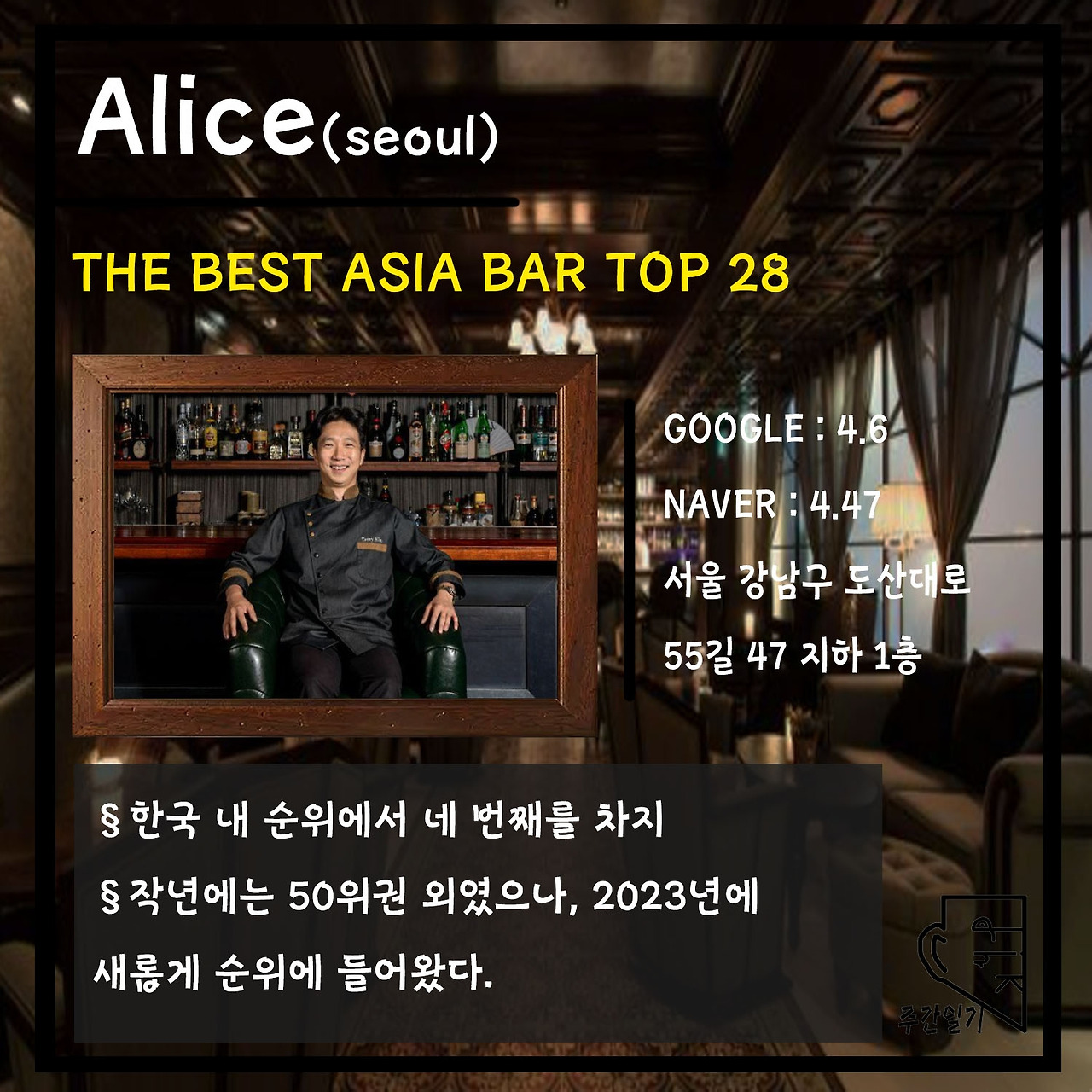 이어서 세 번째는 아시아 내에서 28위를 기록한 'Alice'이다. 구글 기준 4.6, NAVER 기준 4.47로서 구글이 약간 더 높은 평점을 보여주고 있다. 서울 강남구에 위치하고 있으며, 먼저 소개한 바들과 마찬가지로 작년에는 50위권 밖이었으나 엄청난 상승을 보여주면서 아시아에서 28위를 기록하게 되었다.