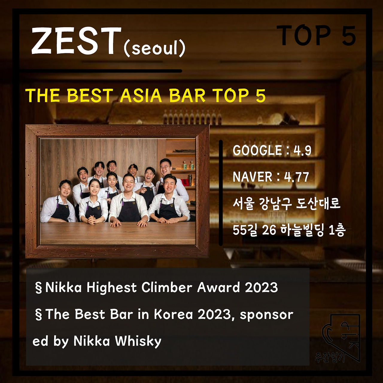 여하튼 'ZEST'가 한국 최고의 바를 수상하게 된 것을 축하하며, 결과에 대한 모든 것은 이유가 있다고 생각한다. 왕관은 아무나 쓸 수 없을 만큼 무거운 것이고, 그 왕관을 견디기 위해선 자격이 있어야 하는 것이니.