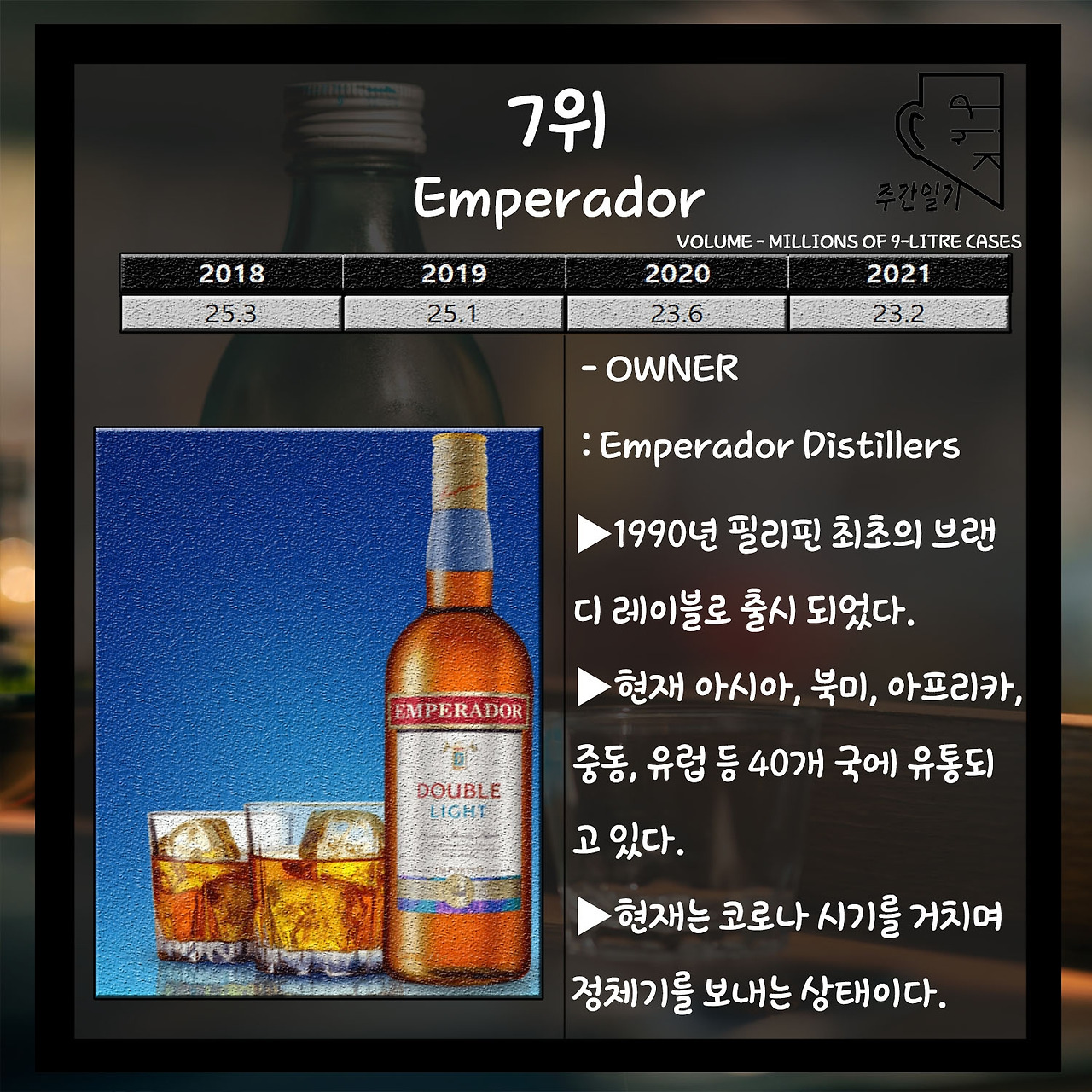 7위는 '엠페라도'이다. 1990년 필리핀 최초의 브랜디로 출시된 이 술은, 섬세한 블렌딩과 숙성 과정을 거쳐서 탄생된다고 한다.