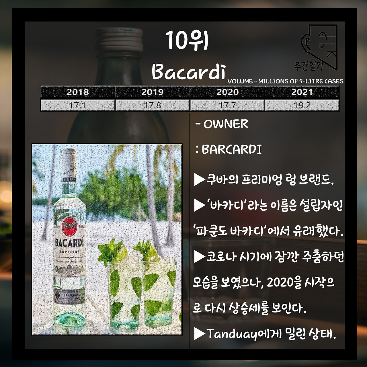 10위는 '바카디'다. 어딜 가던 쉽게 볼 수 있는 제품 중 하나이며, 여러 칵테일을 만들어 마실 수 있어 술을 좋아하는 사람이라면 모를 수가 없는 주류이다.