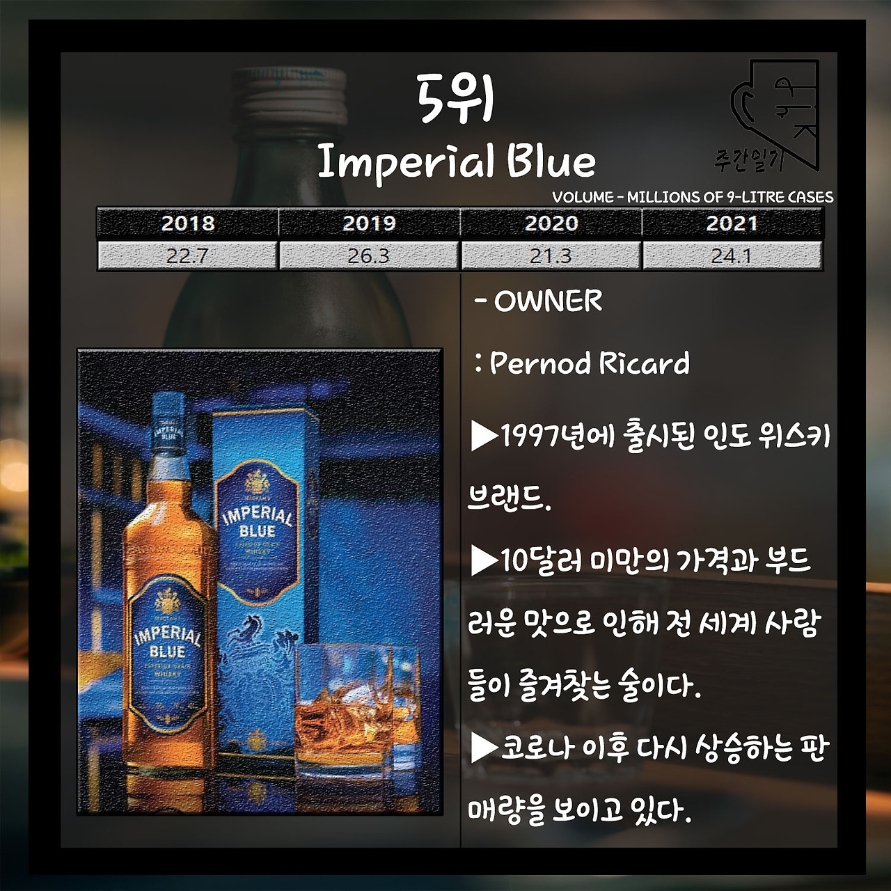 5위는 임페리얼 블루이다. 1997년에 출시된 인도 위스키로서, 9위 'Royal Stag'와 같은 Pernod Ricard가 가진 브랜드 중 하나이다.