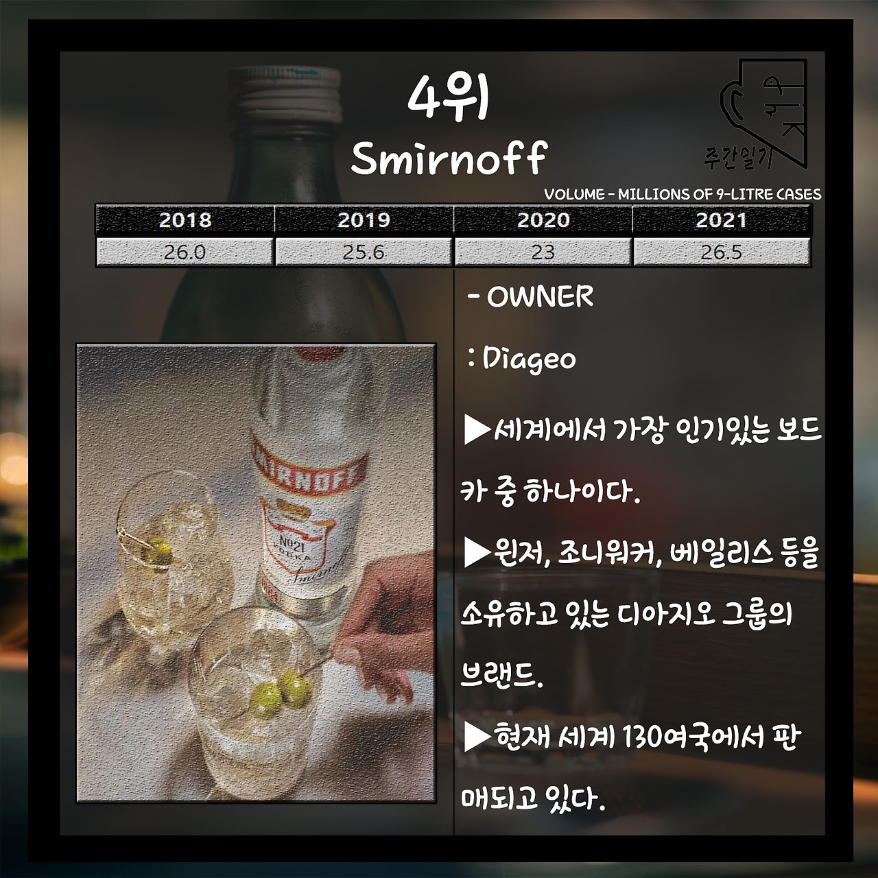 4위는 스미노프이다. 생소한 술들이 상당히 나와서 당황했었는데, 그나마 아는 얼굴이 나온듯 하다.