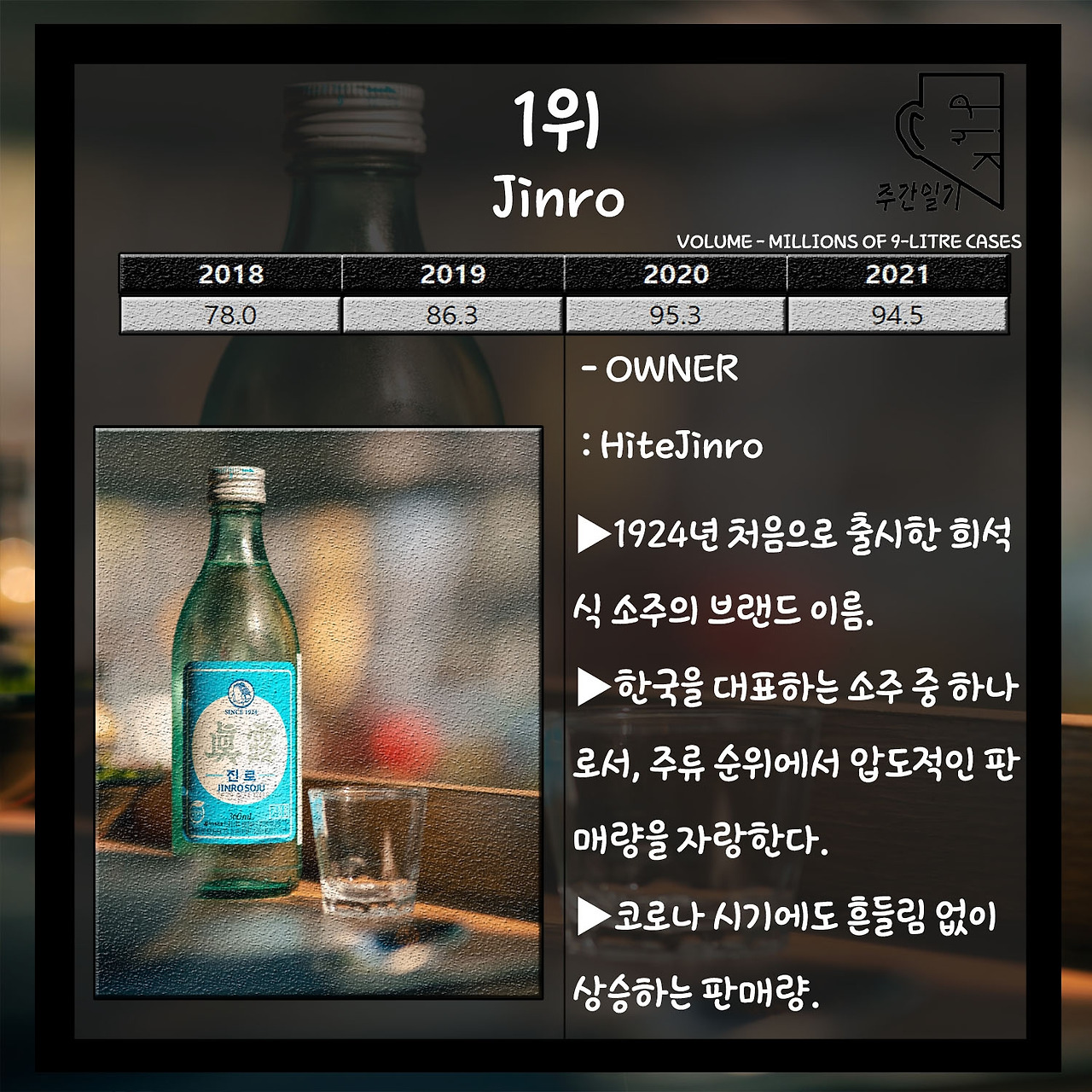 상당히 흥미로운 조사 결과이다. 사람들에게 가장 많이 팔리는 증류주가 '진로'라니, 나 또한 자료를 보기 전에는 전혀 생각지도 못한 결과였다. 소주가 천천히 발을 넓히고 있다는 것은 잘 알고 있었지만, 진작에 최대 판매량을 달성 했다고는 상상도 못하였는데.