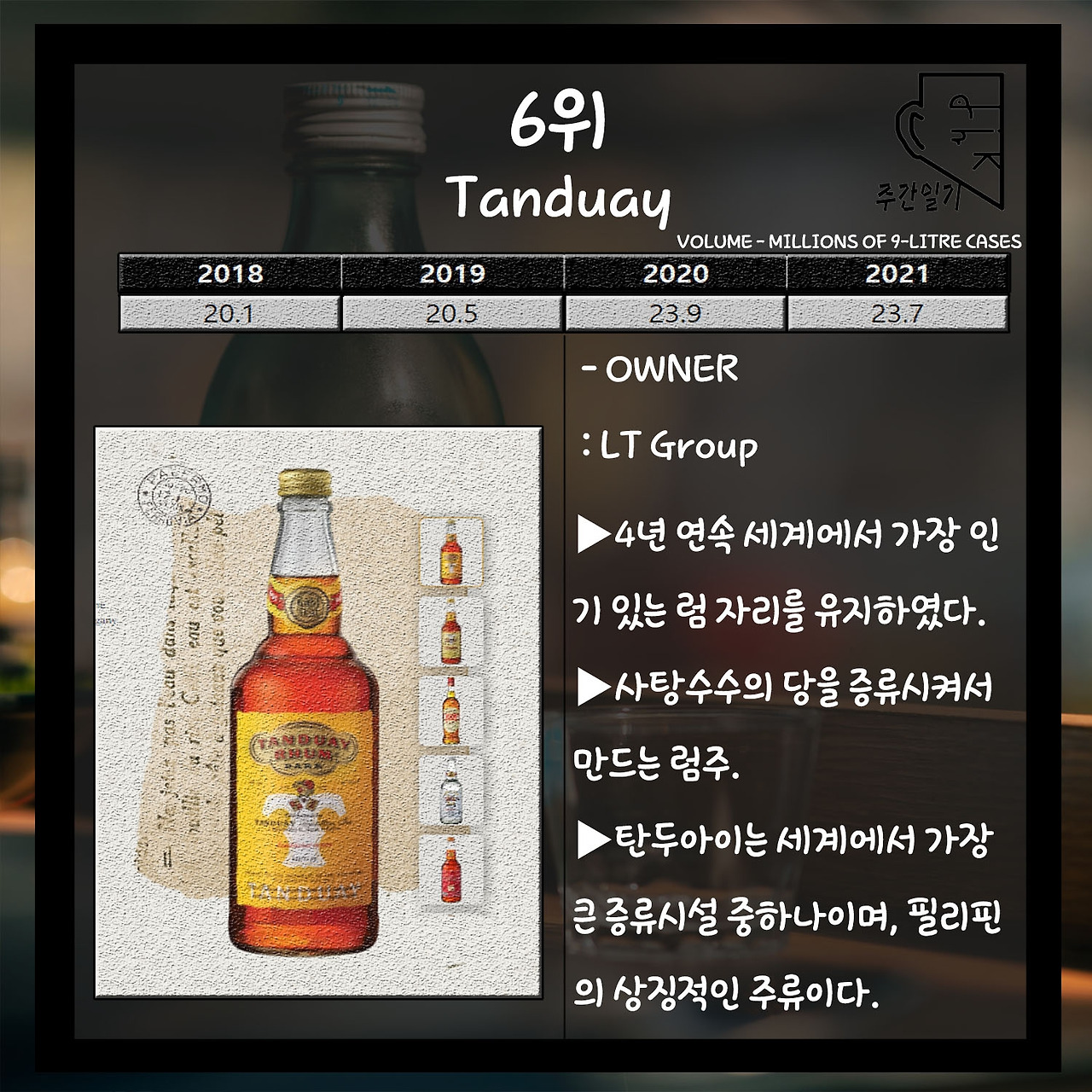 6위는 '탄두아이'이다. 필리핀의 상징적인 주류로서 전통과 명예를 이어가는 이 술은, 4년 연속 세계에서 가장 인기 있는 럼 자리를 유지하는데 성공하였다.